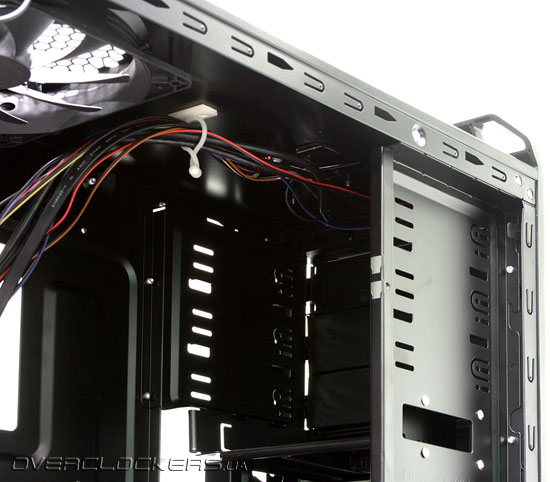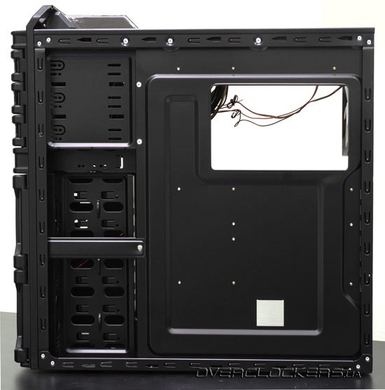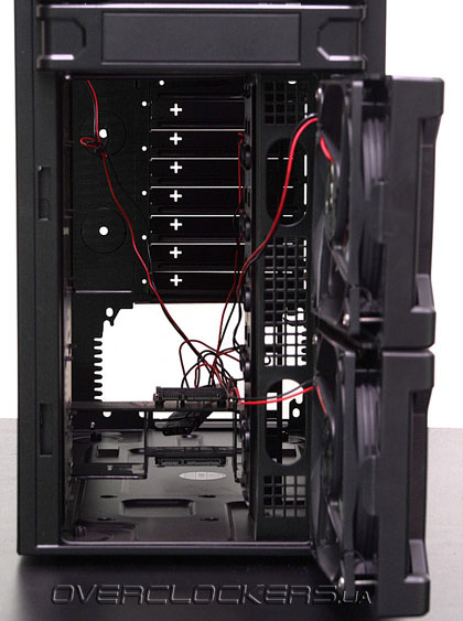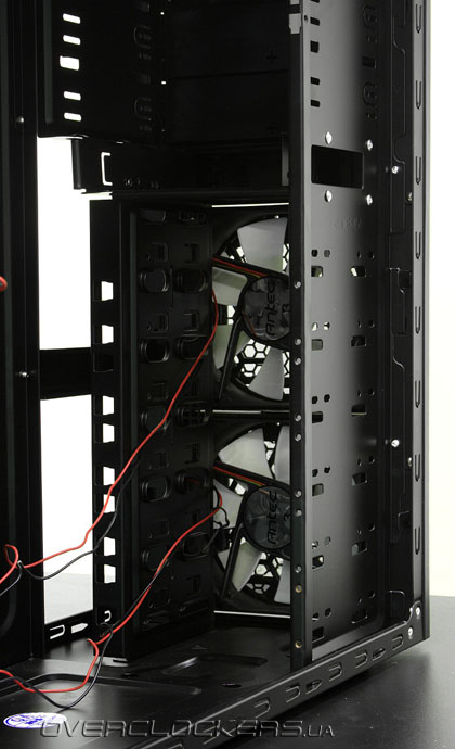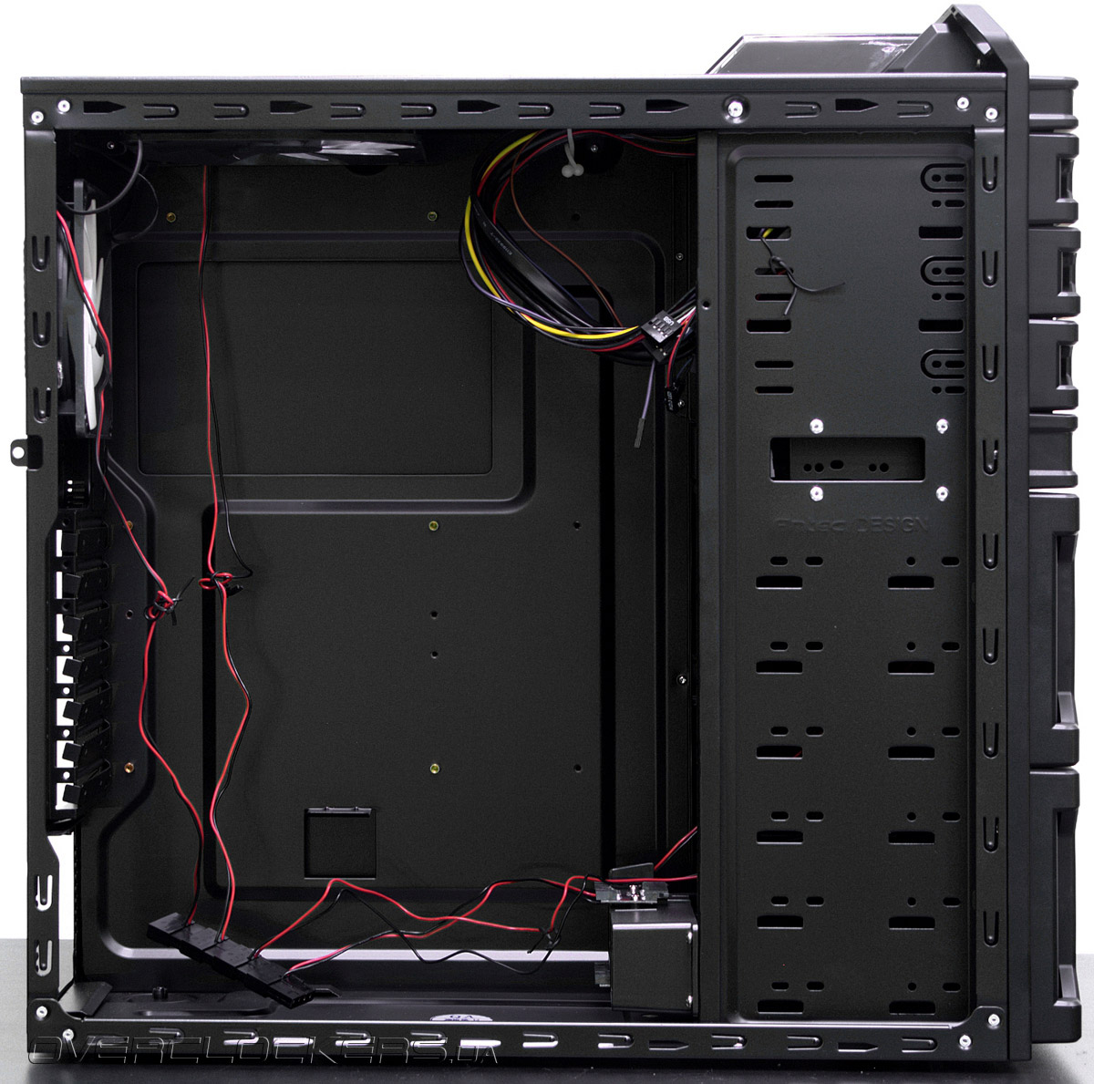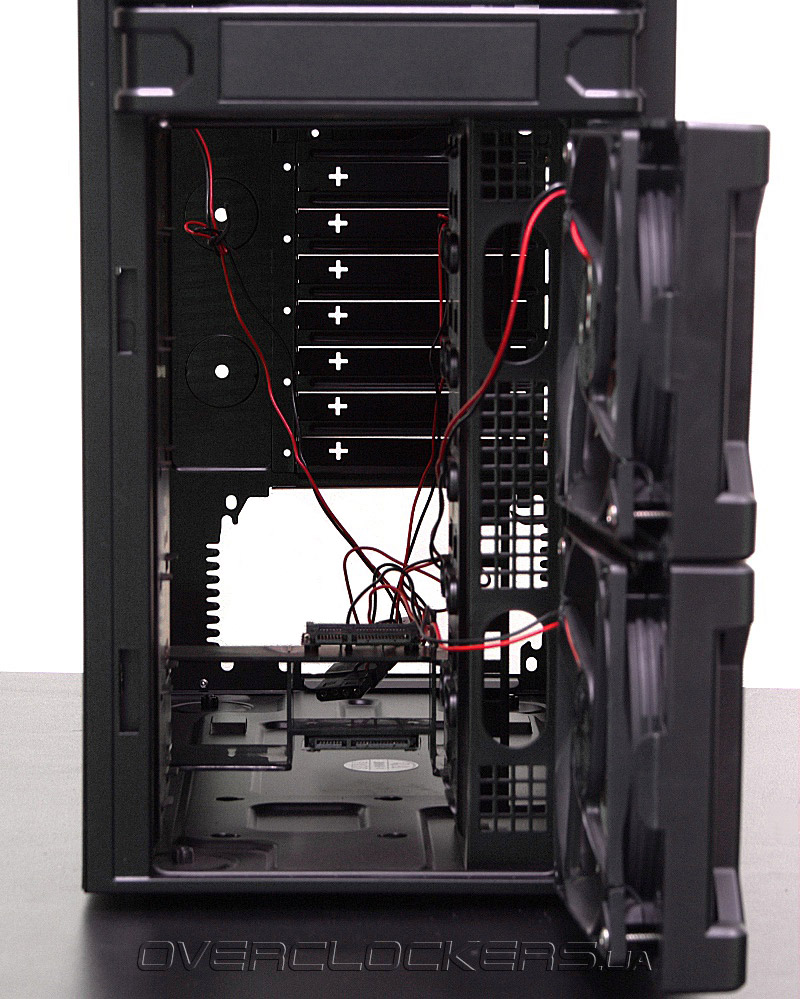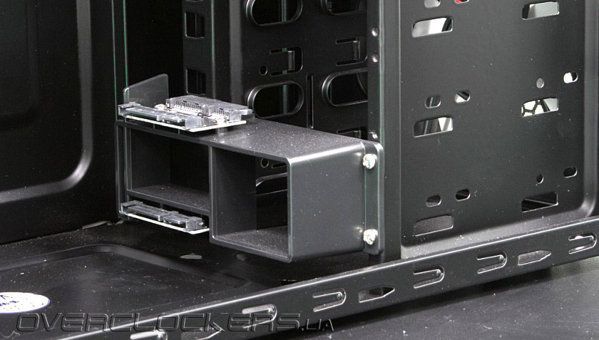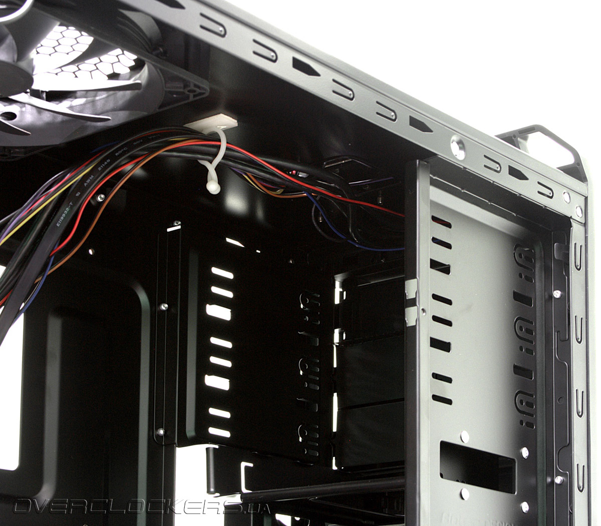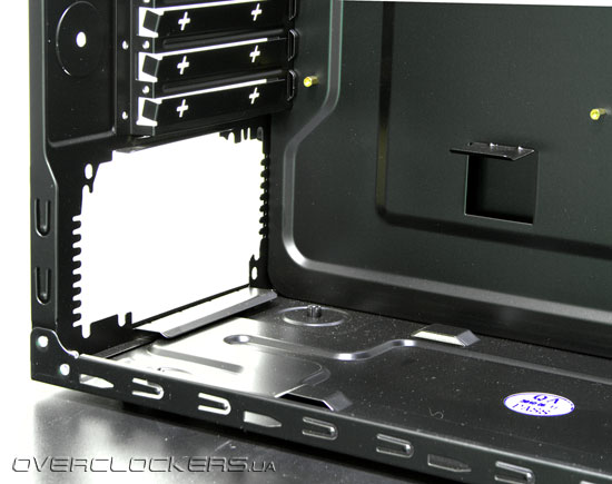 В поддоне имеется значительных размеров отверстие, позволяющее производить установку или замену усилительной пластины системы охлаждения процессора не вынимая при этом материнскую плату. Стойка жестких дисков расположена так, чтобы под нее можно было завести не используемые провода от блока питания. А вот отверстий под укладку проводов за материнской платой не предусмотрено.