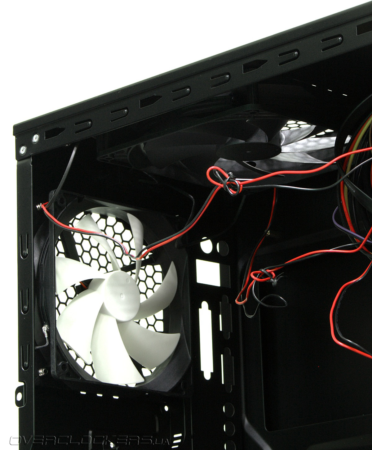 Предустановленный вентилятор имеет белую крыльчатку и снабжен подсветкой. Скорость его вращения регулируется на задней панели.