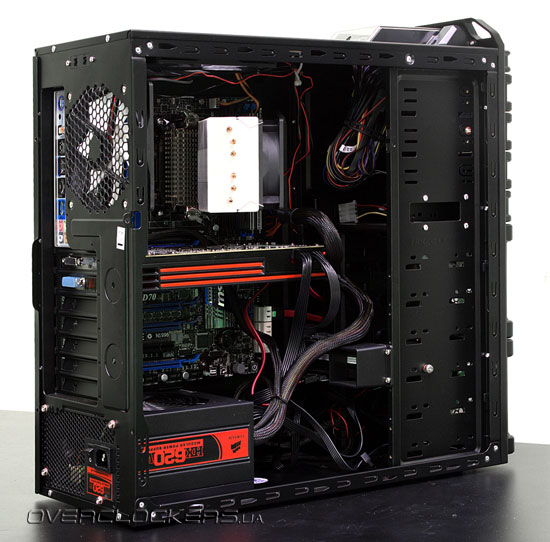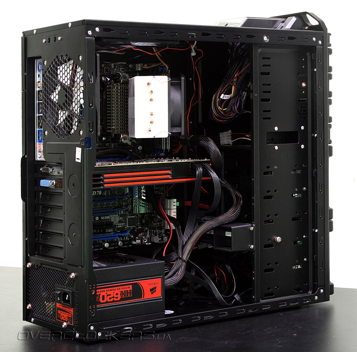 На тыльной стороне корпуса размещены отверстия под монтаж различных интерфейсных устройств. Заглушки под карты расширения выламываемые. Имеются некие заготовки под вывод наружных компонентов СВО, однако воспользоваться ими без применения металлообрабатывающих устройств не выйдет. Размещение блока питания нижнее, монтажные крепления симметричны, что подразумевает теоретическую возможность установки БП различными способами.