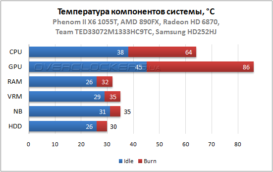 Никаких сравнительных тестирований в рамках данного материала по объективным причинам не проводилось. Но чтобы проверить, нет ли в устройстве «мертвых зон» движения воздушных масс, и вообще, является ли оно работоспособным мы провели экспресс-тестирование температурного режима основных узлов ПК. На радиаторы VRM, северного моста и памяти были установлены термодатчики многофункциональной панели. Температуры CPU, графического адаптера и HDD снимались посредством специальных утилит. Для нагрузки соответствующих комплектующих были использованы: тест ОССТ, бенчмарк 3DMark06 и папка размером 4 гигабайта, заполненная файлами, размером около 5 мегабайт каждый. Обороты вращения корпусных вентиляторов были зафиксированы на минимально доступных значениях. Были получены следующие результаты: