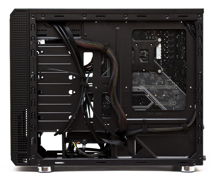 Сборка системы в корпусе Antec P5 не вызывает особых затруднений. Заранее следует подумать о подключения кабеля питания процессора, чтобы потом не делать это в стесненном пространстве в верхнем заднем углу шасси. Установить кулер тоже имеет смысл до монтажа материнской платы, если на нем есть усилительная пластина, так как в профиль выреза она не попадает. В остальном все достаточно удобно и даже кабеля, если постараться, можно разложить за поддоном.