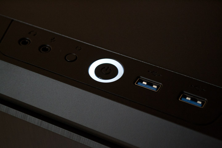 Спаренный белый индикатор питания и активности накопителей не особо яркий и не давит на глаза.