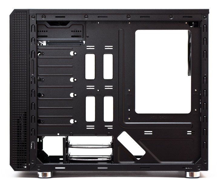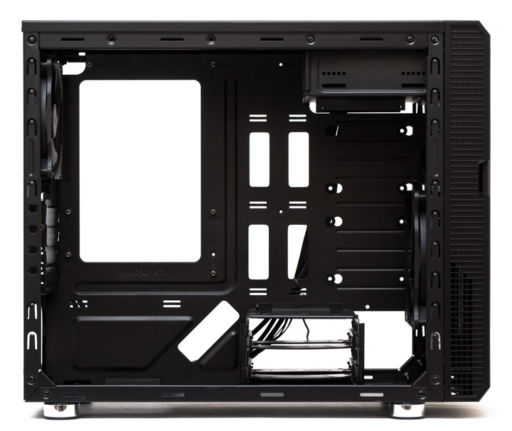 За поддоном материнской платы есть запас пространства по ширине в 15 мм до боковой панели. Не слишком много, но можно уложить толстые провода в один слой. Прямоугольный вырез под усилительную пластину процессорного кулера почему-то сделан вертикально, а не горизонтально. Для протяжки проводов имеется семь мелких и одно крупное отверстие, и еще восемь проушин для фиксации кабельных стяжек. В передней части поддона есть два посадочных места для 2,5″ накопителей, оснащенных резиновыми демпферами/креплениями.