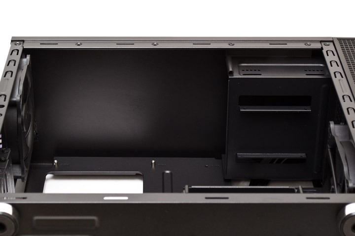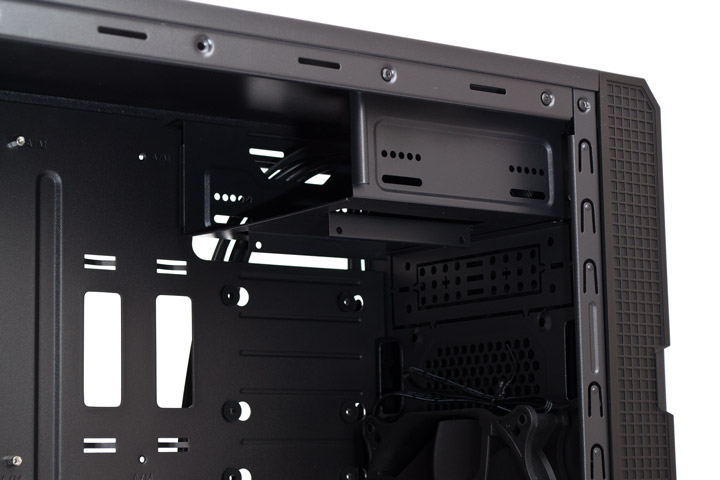 В верхней передней части корпуса расположен лоток под одно 5,25″ устройство, которое редко сейчас встретишь в современных системах. Под ним есть крепления для еще одного 2,5″ накопителя. С учетом материнской платы стандартной ширины в 244 мм, сюда можно поставить 5,25″ привод не длиннее 185 мм и закрепить его обычными винтами.