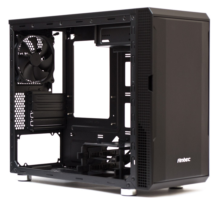 Корпус Antec P5 поддерживает установку в вертикальном положении материнских плат формата MicroATX и Mini-ITX. Допустимая высота процессорного кулера — 160 мм по нашим измерениям (официально заявлена 155 мм). Допустимая длина плат расширения во всех слотах составляет 360 мм вместе с установленными впереди вентиляторами толщиной в 25 мм. Длина блока питания ограничена корзиной накопителей и с минимальным запасом в это пространство (210 мм суммарно) поместится БП длиной в 180 мм с учетом изгибов проводов. Корзину можно сдвинуть вперед на 30 мм, тогда помещаются и 200 мм, официально заявленных производителем.
