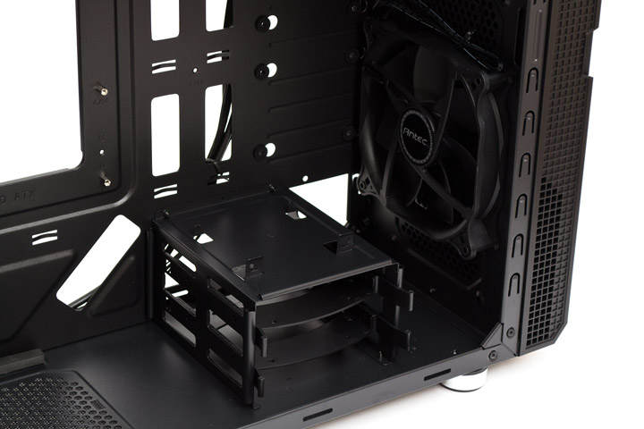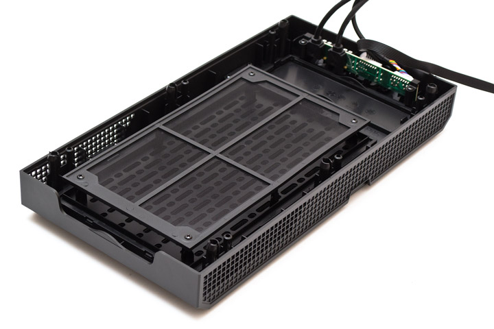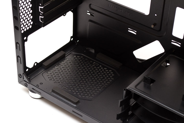 На нижней панели есть четыре ножки. Отверстие для вентиляции БП закрыто от пыли сеткой металлического фильтра. Посередине есть четыре винта, выкрутив которые можно отрегулировать положение корзины для жестких дисков, сдвинув ее вперед или ближе к блоку питания. Отверстие для снятия фронтальной панели сделано в ее нижней грани. По совместительству оно выполняет роль дополнительной вентиляции.