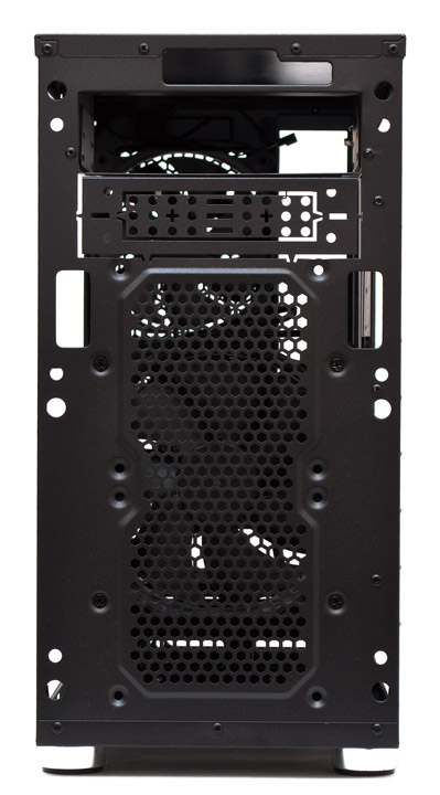 Задняя панель корпуса сделана стандартно. На вытяжную вентиляционную решетку изнутри неподвижно крепится один 120-мм вентилятор. Слотов расширения PCI четыре, все закрыты сплошными заглушками. Две верхние из них многоразовые, а две нижние одноразовые, выламываемые. Справа от слотов есть еще одна небольшая решетка. Крепежные отверстия на расположенном внизу посадочном месте блока питания позволяют поставить его как вентилятором вниз, так и вверх.