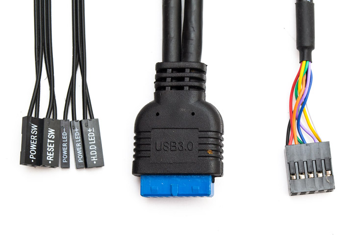 В набор кабелей от корпуса входит шлейф из четырех пар проводов от кнопок запуска и перезагрузки системы, индикатора питания и работы накопителей, разъем USB 3.0 и колодка HD Audio. Все провода черного цвета и имеют достаточную для подключения длину.