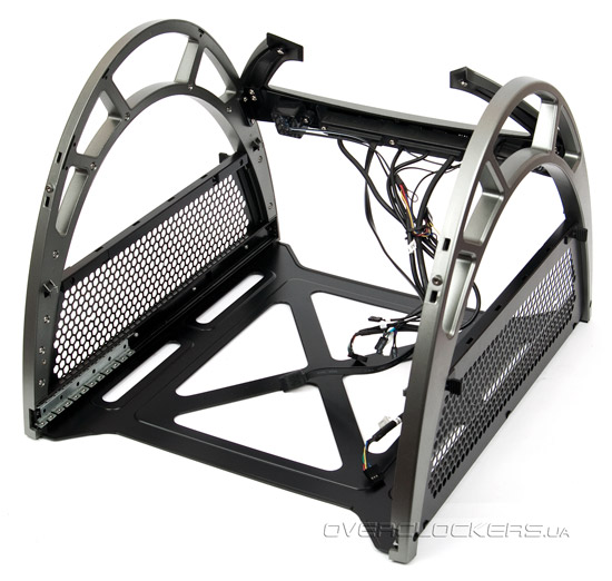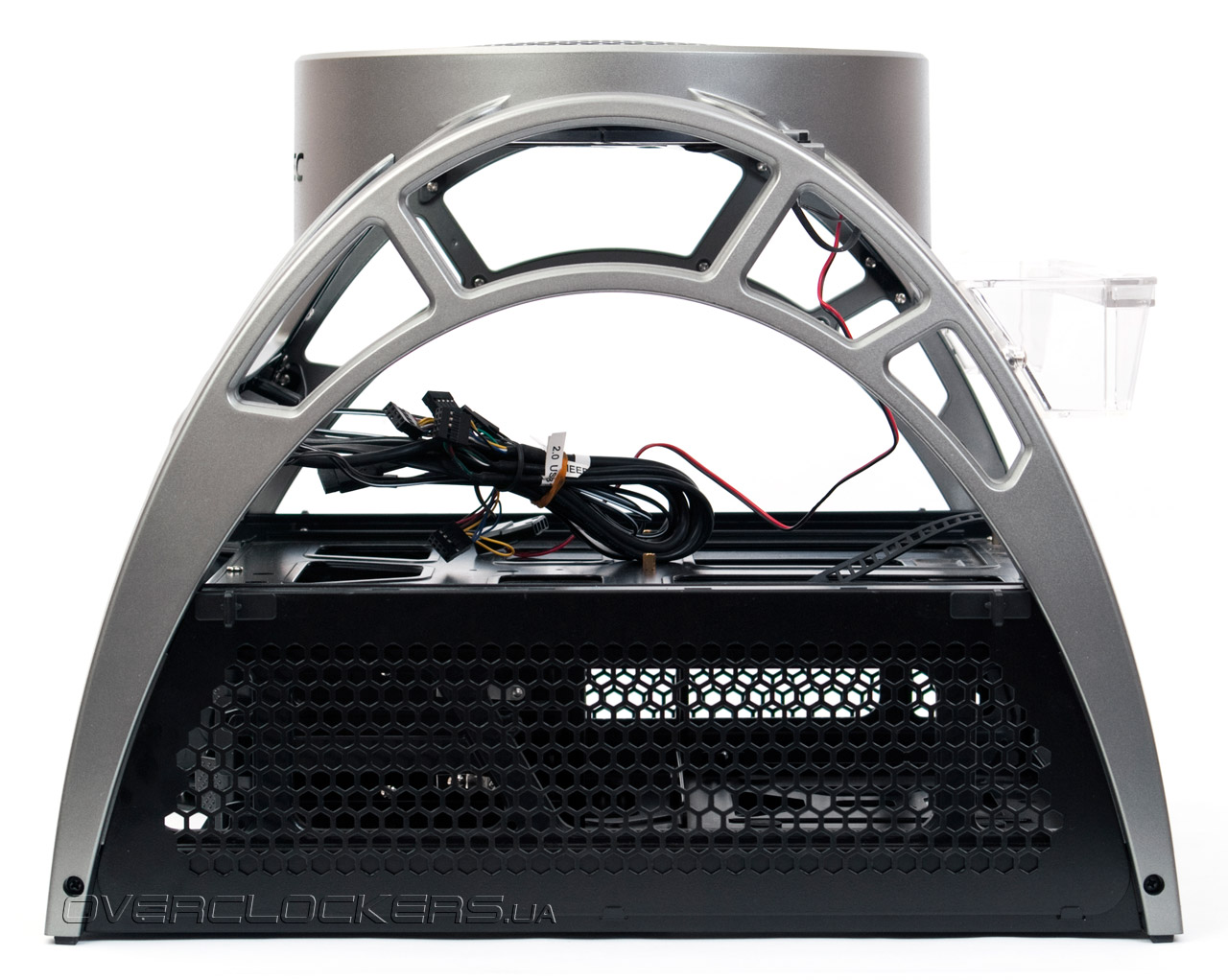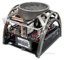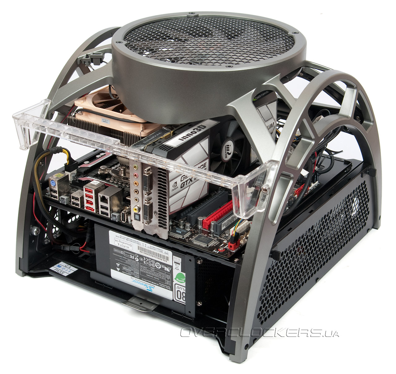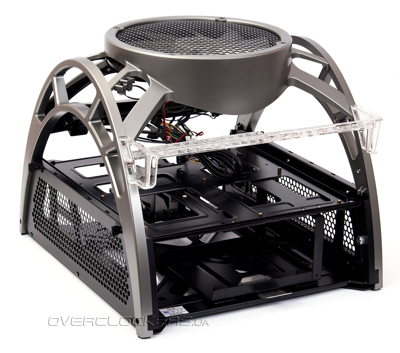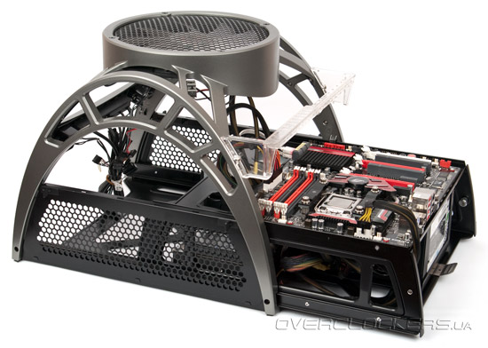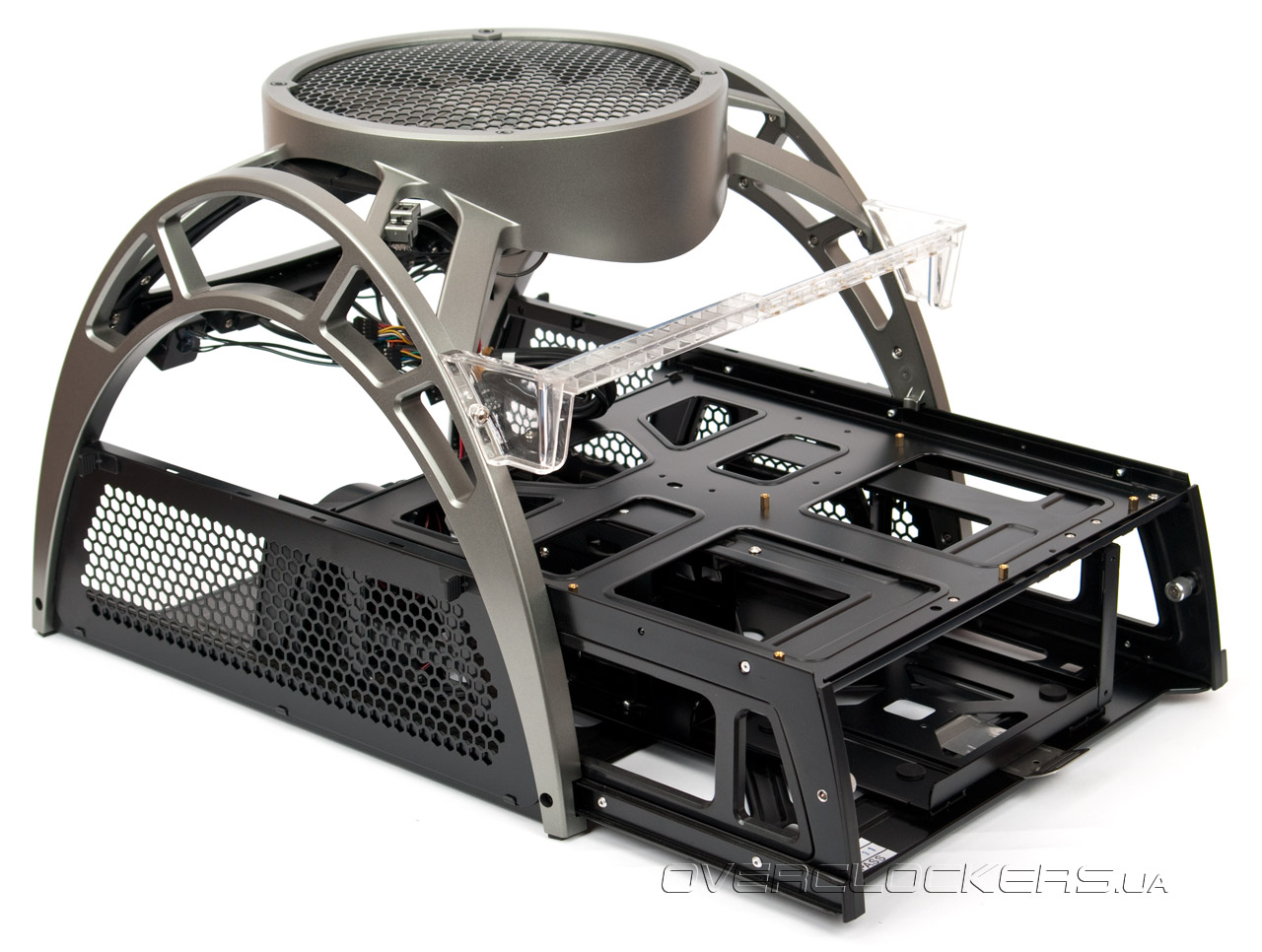 Выглядит Skeleton потрясающе и массивно одновременно. Боковые стенки в виде арок соединяются тонкими перемычками с «куполом», в котором установлен 250-мм вентилятор с защитной сеткой. Пространство под ним делится на две части: в нижней располагается блок питания и накопители, а в верхней — материнская плата.