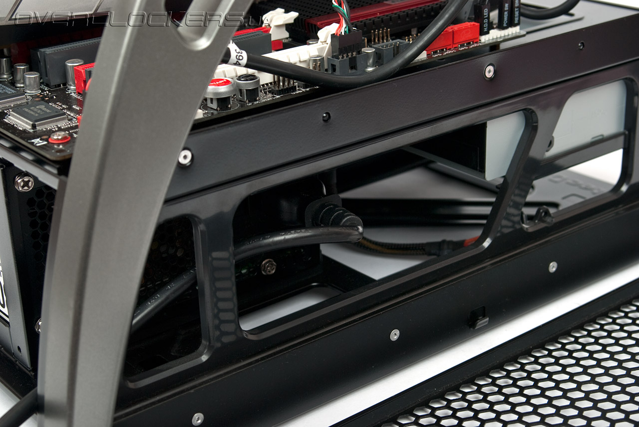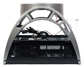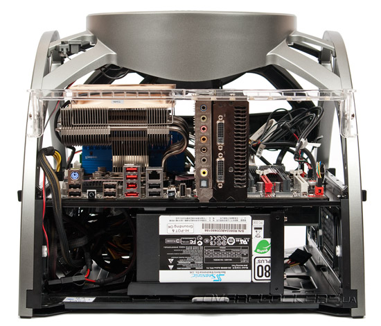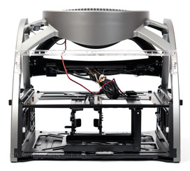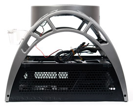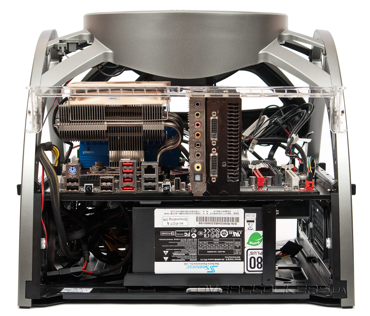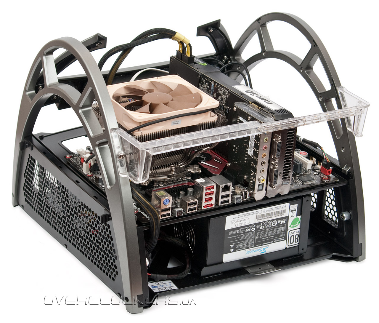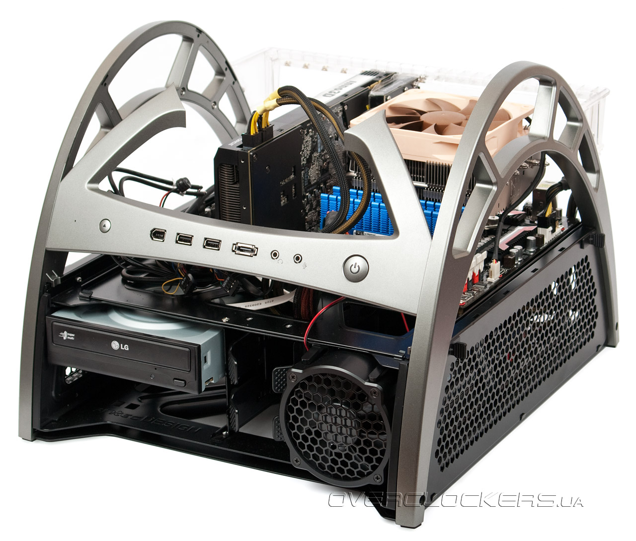 Выглядит Skeleton потрясающе и массивно одновременно. Боковые стенки в виде арок соединяются тонкими перемычками с «куполом», в котором установлен 250-мм вентилятор с защитной сеткой. Пространство под ним делится на две части: в нижней располагается блок питания и накопители, а в верхней — материнская плата.