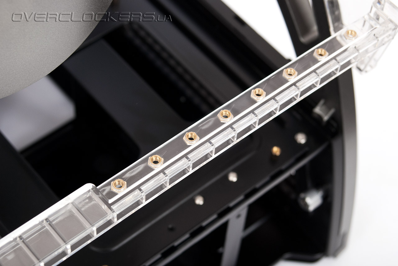 На задней части корпуса установлена перекладина из прозрачного пластика для крепления плат расширения. Учитывая поддержку форм-фактора ATX, всего можно закрепить восемь карт. За перекладину желательно не браться, иначе ее можно попросту сломать.