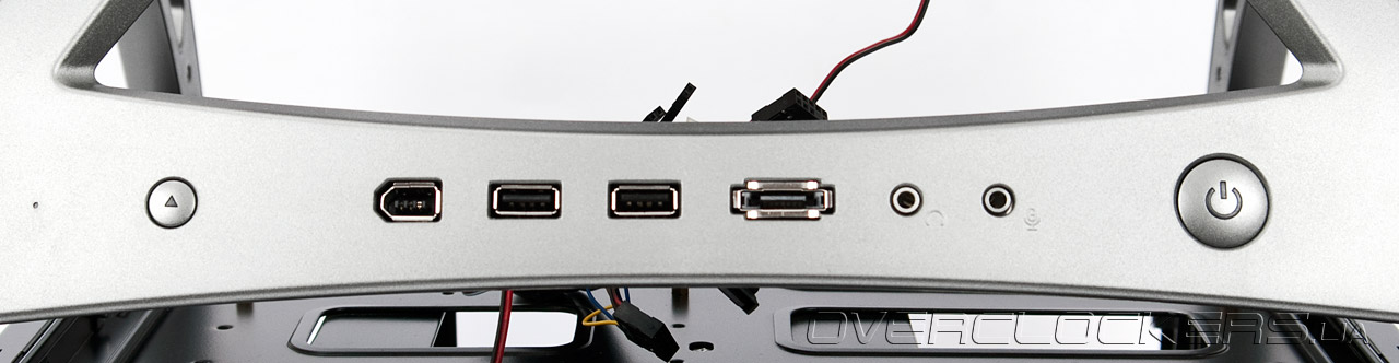 Широкая перемычка между стенками играет роль передней панели, на которой расположены кнопки включении и сброса, один разъем FireWire, два USB, один порт eSATA и пара аудиоразъемов. Кнопка Power параллельно работает в качестве индикатора включенной системы, а за активность накопителей отвечает светодиод слева от кнопки Reset. Оба светятся ярко-синим цветом.