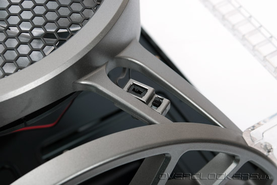 Верхний вентилятор имеет разноцветную подсветку, которая может автоматически, либо по желанию пользователя, менять цвет, для чего предусмотрен переключатель.