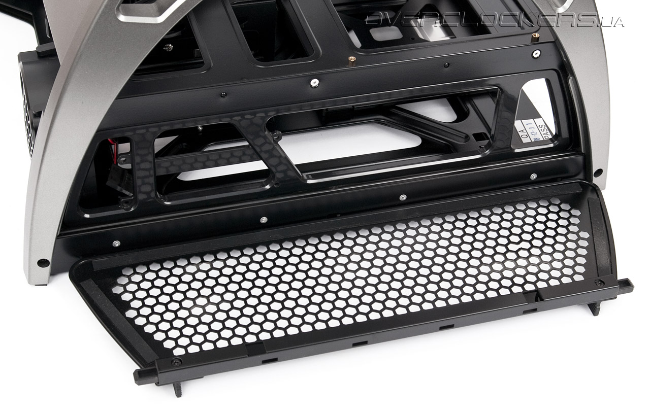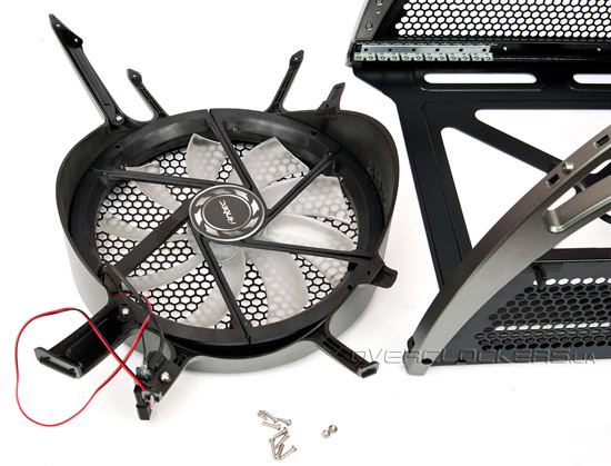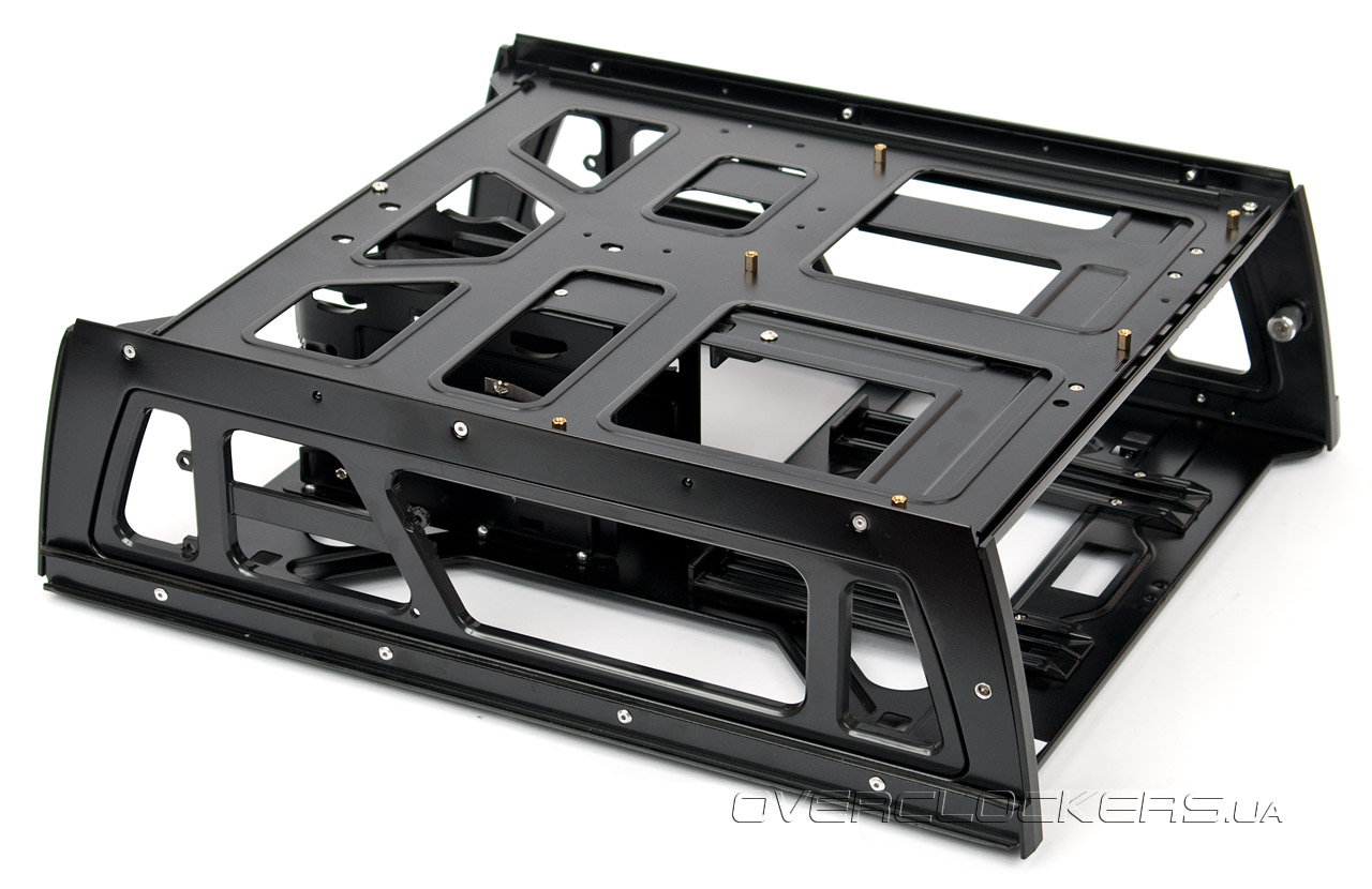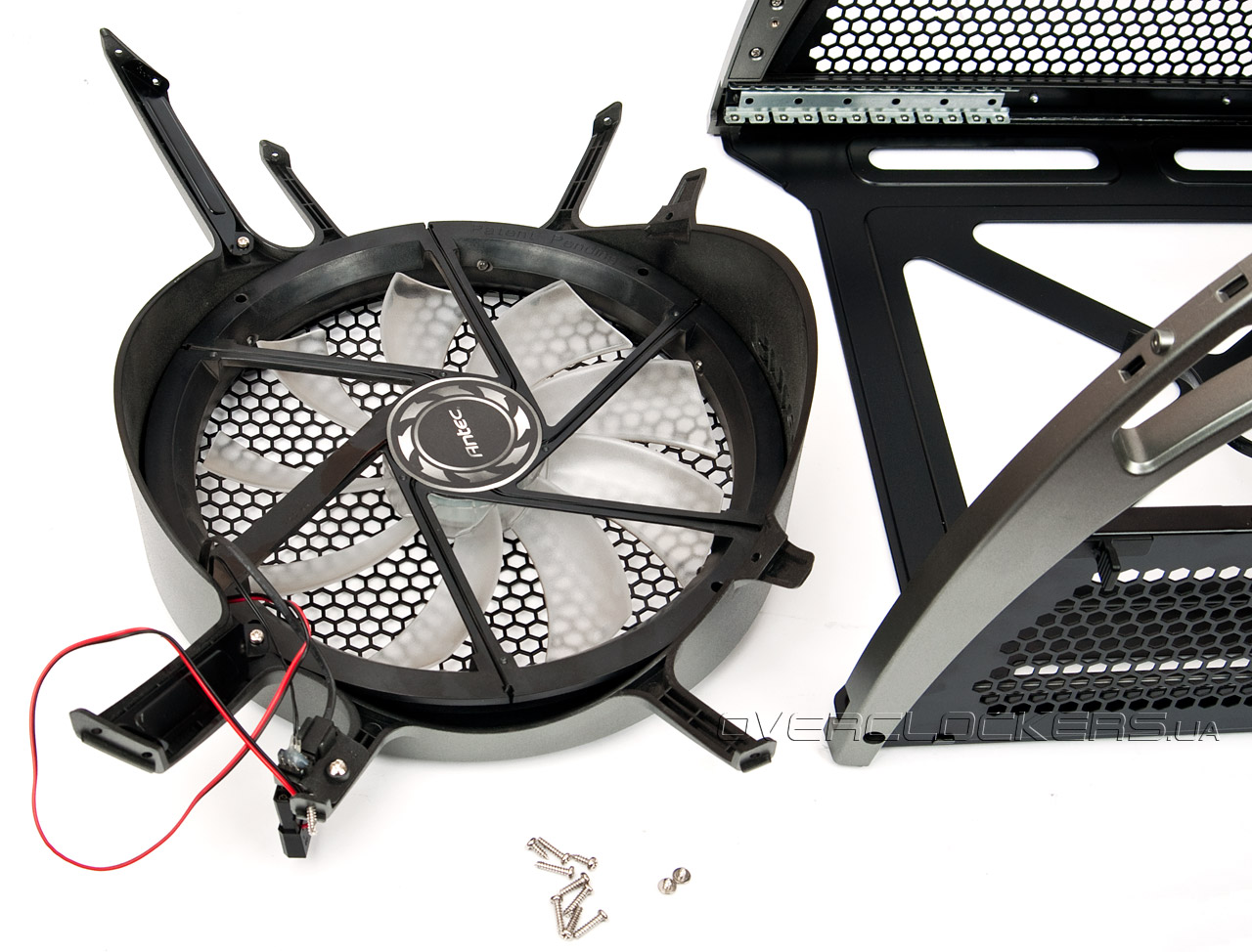Конечно, использовать корпус открытого типа Skeleton в качестве бенч-стенда не очень удобно. В первую очередь этому мешает расположенный сверху 250-мм вентилятор. Но если от него избавиться? Верхняя крышка с перемычками цельная, дополнительно армирована стальными пластинами, — крепится она к боковым пластиковым стенкам обычными шурупами.