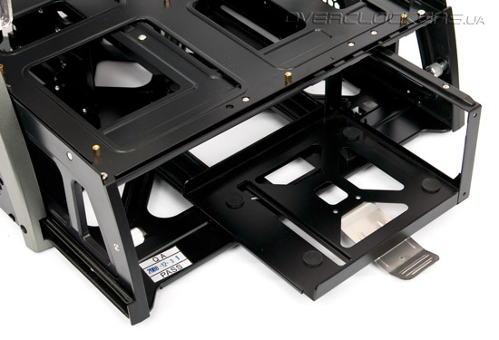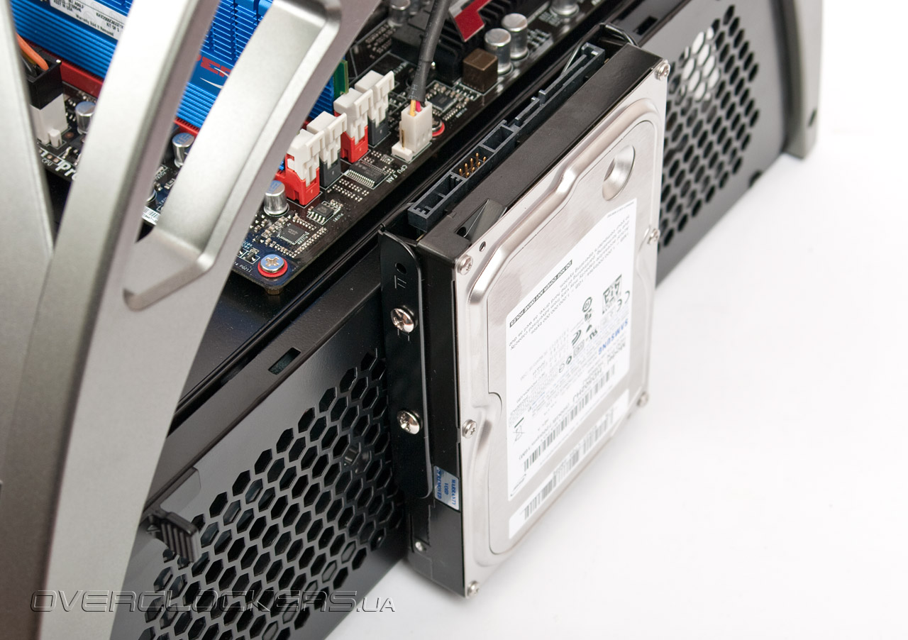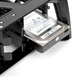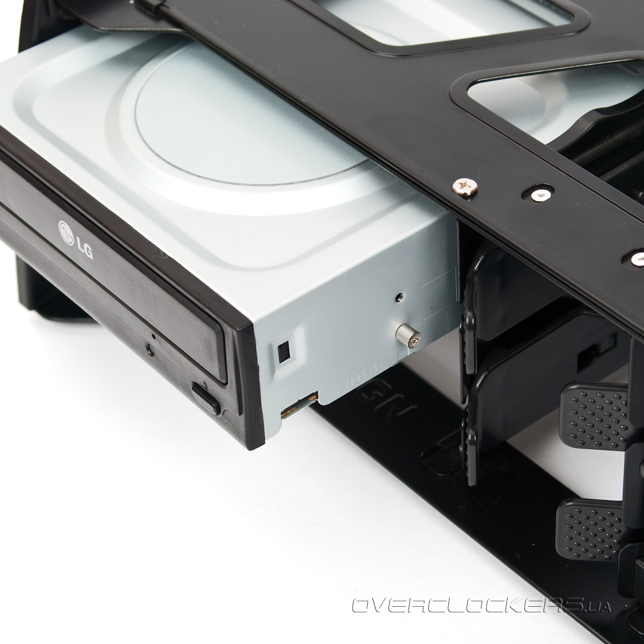 После чего накопители устанавливаются в свой отсек с передней части шасси. Каждая такая своеобразная корзина обладает направляющими для двух устройств и парой защелок. Винчестер и привод по направляющим вставляется до щелчка. Если надо их извлечь, то оттягиваем в сторону защелку и вытягиваем накопитель. Что-то похожее используется в корпусах Chieftec для устройств 5,25".