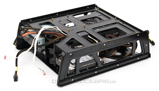 Итак, шасси почти собрано. Подключаем кабели к приводам, свободные концы всех шлейфов просовываем через поддон в передней части. Кстати, он съемный, что еще больше облегчает процесс сборки.