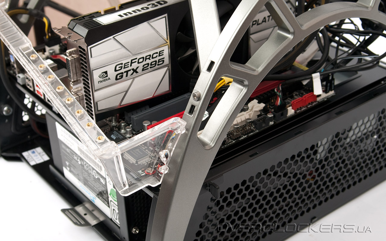 Установка плат расширения особых проблем не вызывает. Только сначала надо снять перекладину, а после размещения графического акселератора (места достаточно даже для топовых решений) и других карт вернуть ее на место. Подключая кабели питания к видеокарте, придется попотеть — сказывается ограниченное пространство под верхним вентилятором.