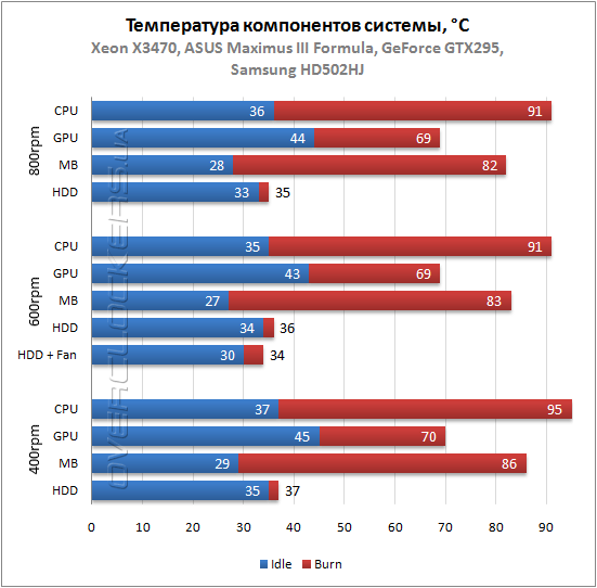 Вентилятор на среднем положении переключателя создает не так много шума, как при максимальной скорости, но температурный режим компонентов в обоих случаях практически одинаков. С переходом к более тихой работе больше всего растет температура процессора. В таком случае, придется либо уменьшать уровень разгона, либо искать более эффективную систему охлаждения, при этом, не забывая о ее компактных размерах.