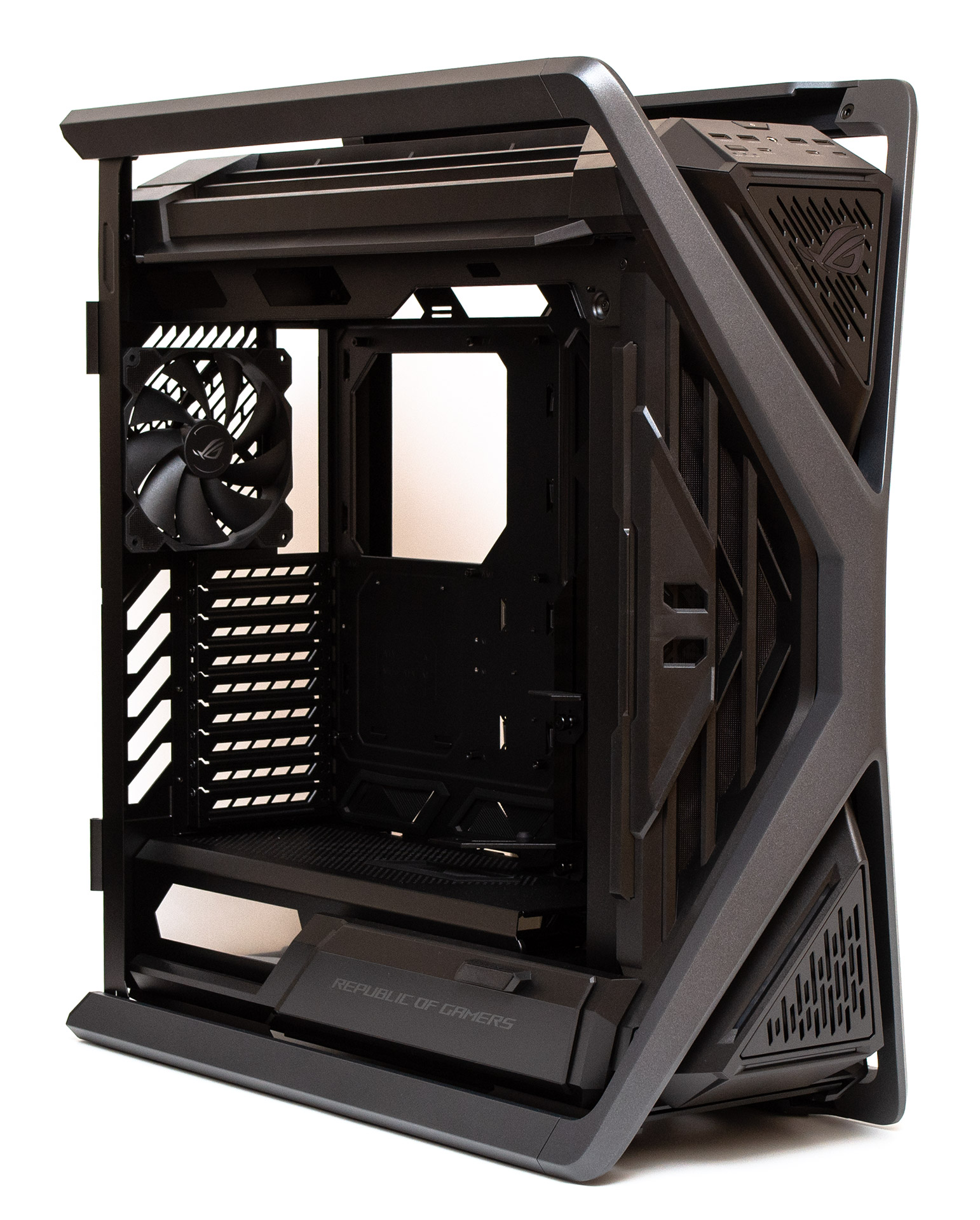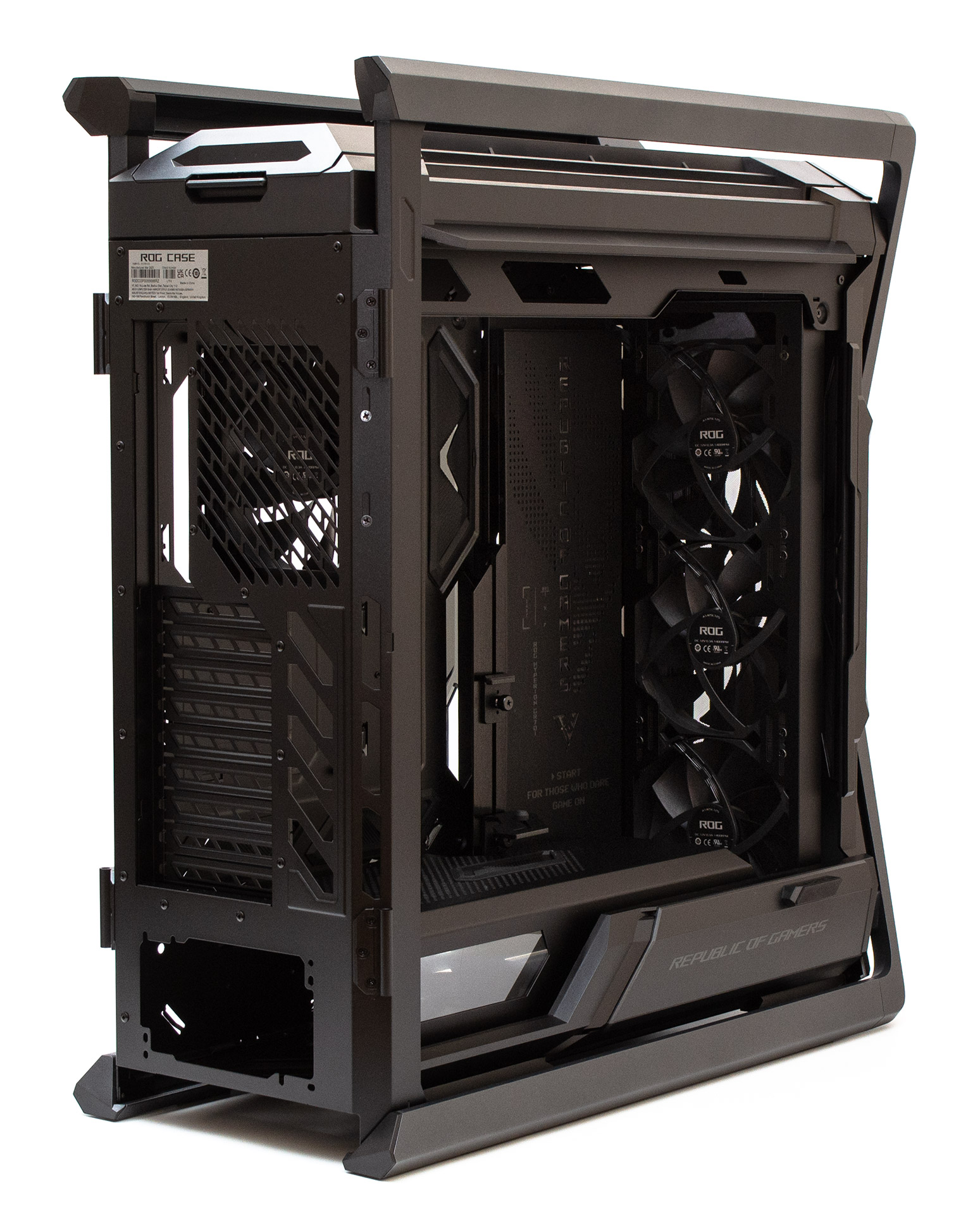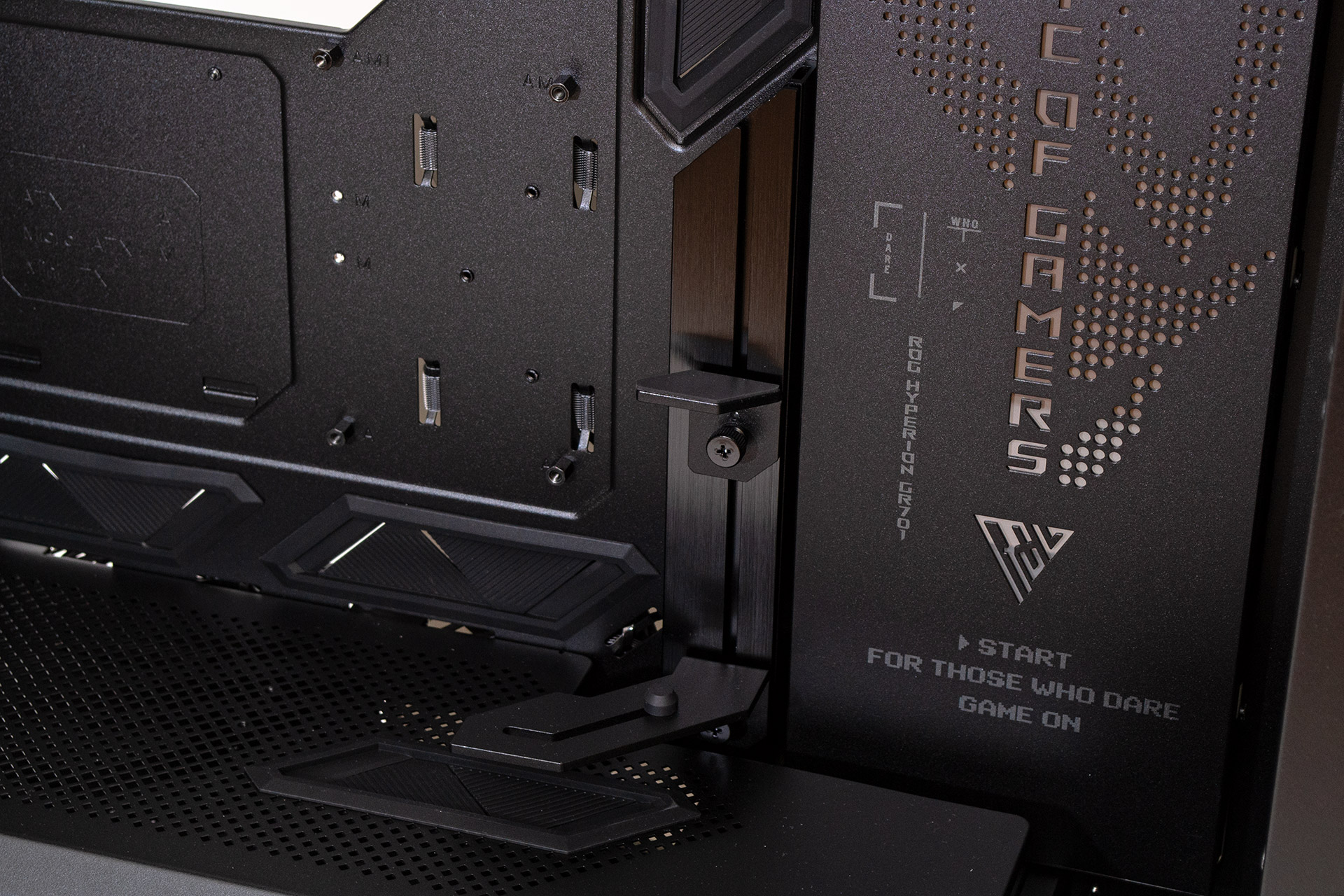 Корпус ASUS ROG Hyperion GR701 поддерживает в вертикальном положении материнские платы формата E-ATX (305х277 мм), ATX, MicroATX и Mini-ITX. Максимальная высота охлаждения процессора составляет 190 мм. Максимальная длина для видеокарт равна 460 мм во всех девяти слотах. Официально длина блока питания может составлять до 240 мм, при этом еще 65 мм останется за ним для укладки и поворота проводов.