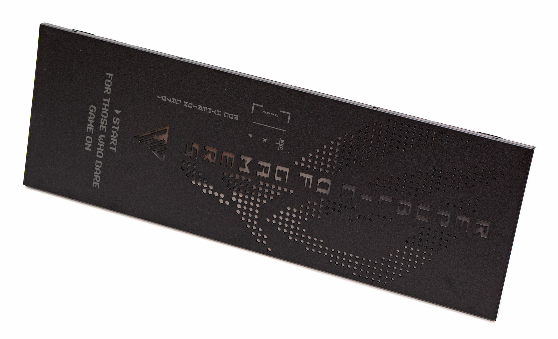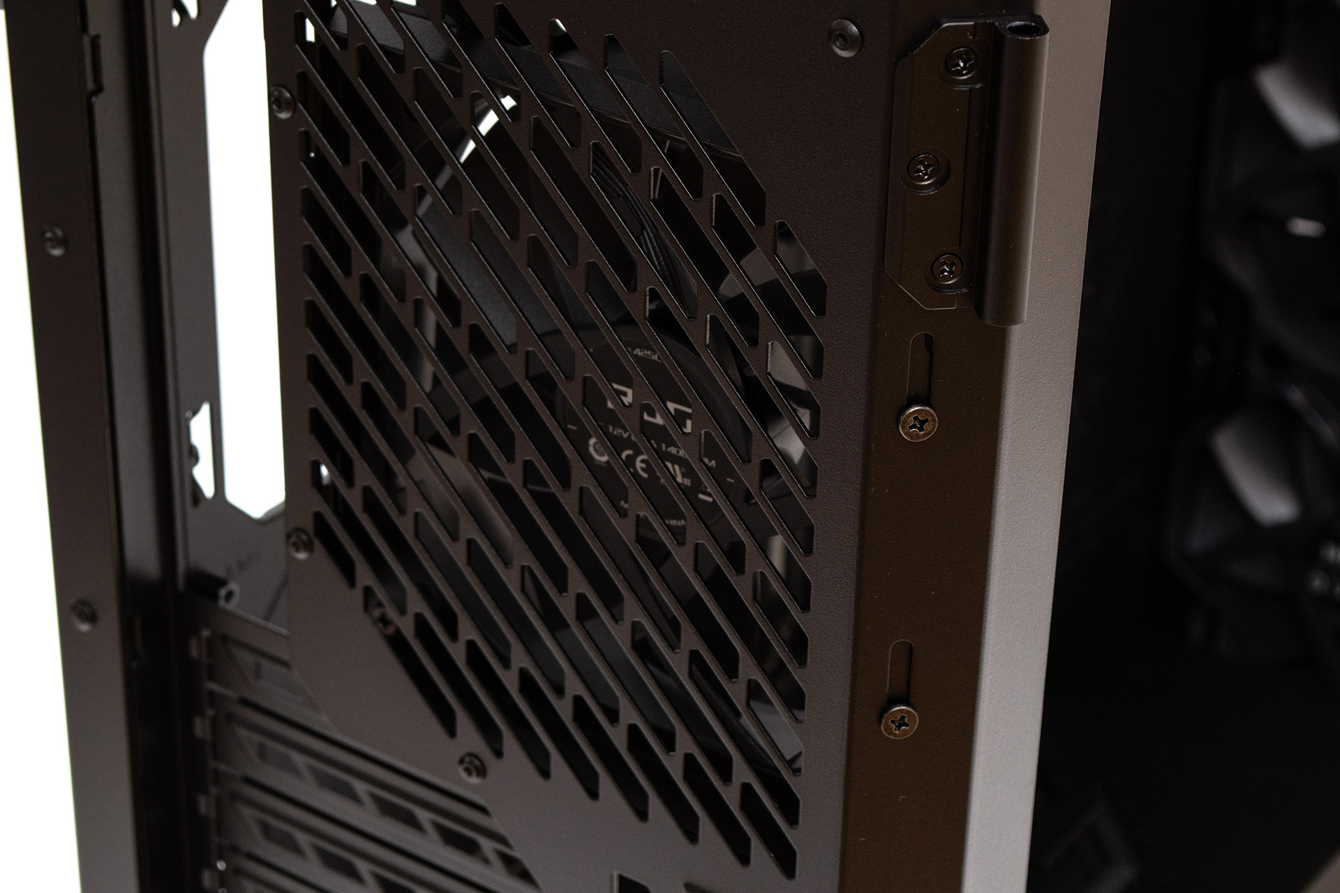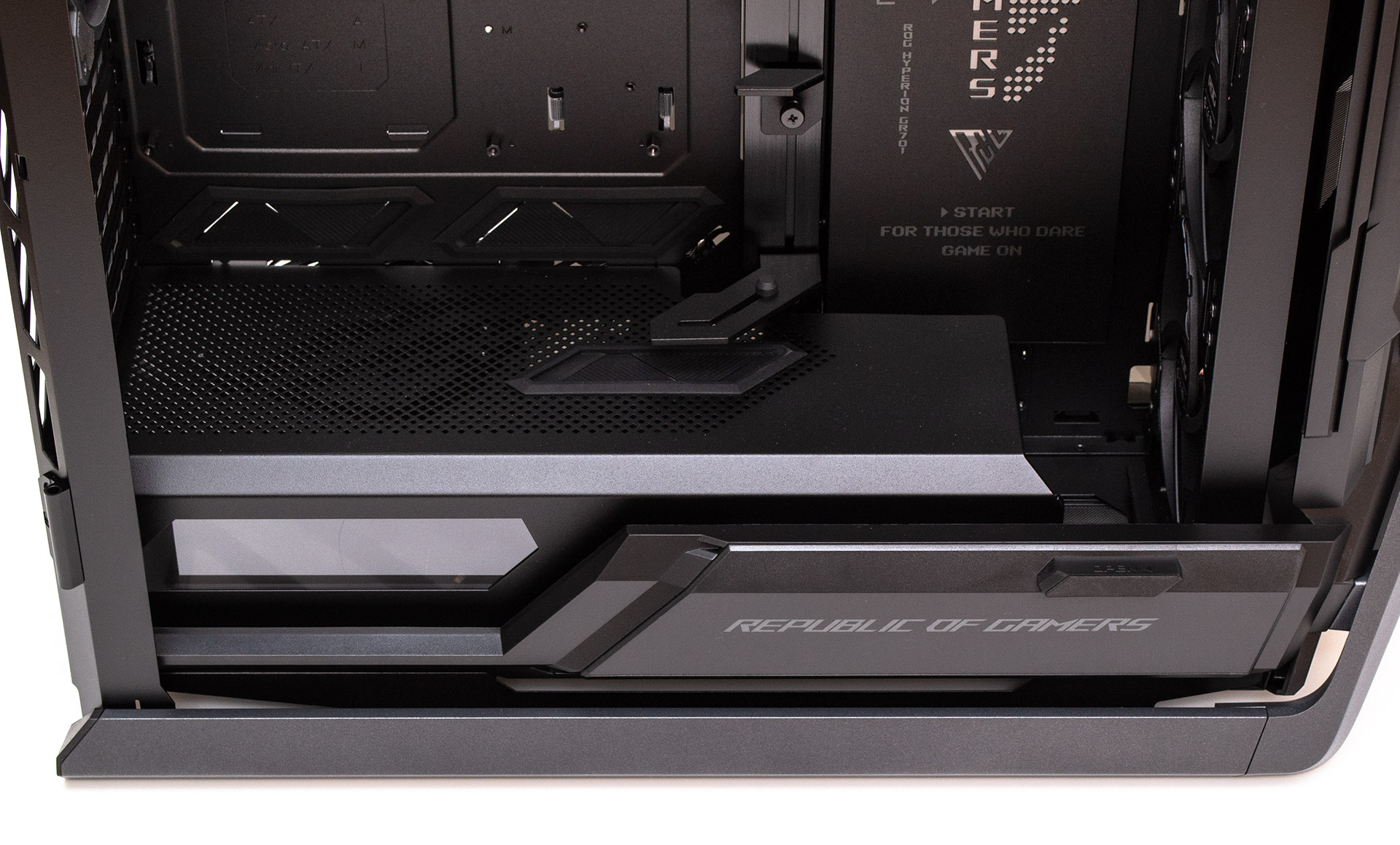За поддоном материнской платы этого корпуса имеется запас пространства от 34 до 38 мм для укладки кабелей. Передняя часть поддона дополнительно закрыта прозрачной крышкой из акрила, которая держится на двух винтах с правой стороны и двух петлях слева. В нем также есть отверстие напротив потенциального места установки боковых вентиляторов.