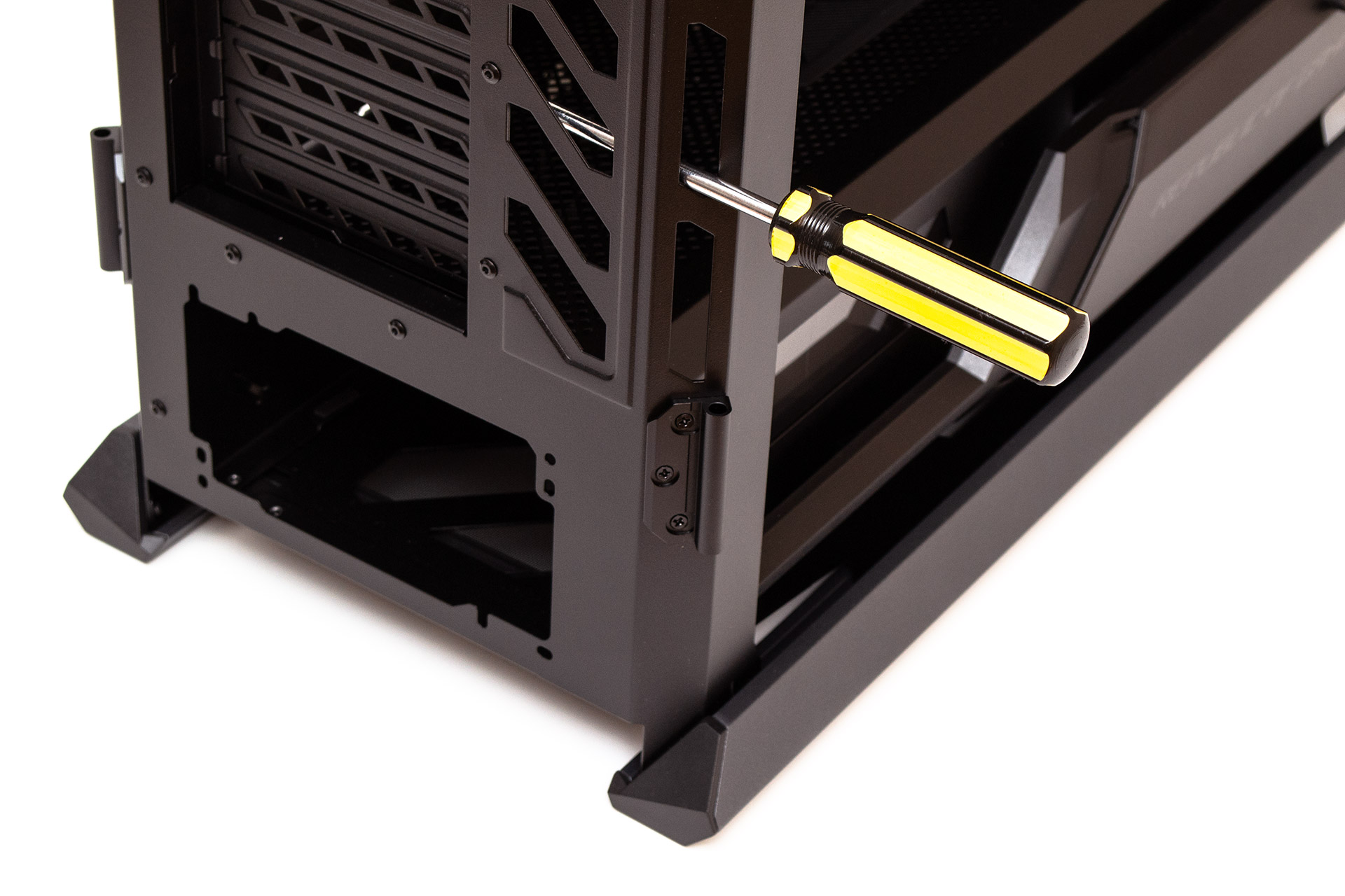Держатель видеокарты выполнен в виде вертикальной алюминиевой рейки, по которой двигаются две отдельные Г-образные подпорки, закрепленные одним винтом с накатанной головкой каждая. Более короткая опора может поддерживать карты длиной от 275 мм и больше в горизонтальной ориентации. Опора подлиннее может держать вертикально или горизонтально установленные видеокарты длиной от 250 мм и больше. Под рейкой есть дополнительные отверстия для укладки кабелей.