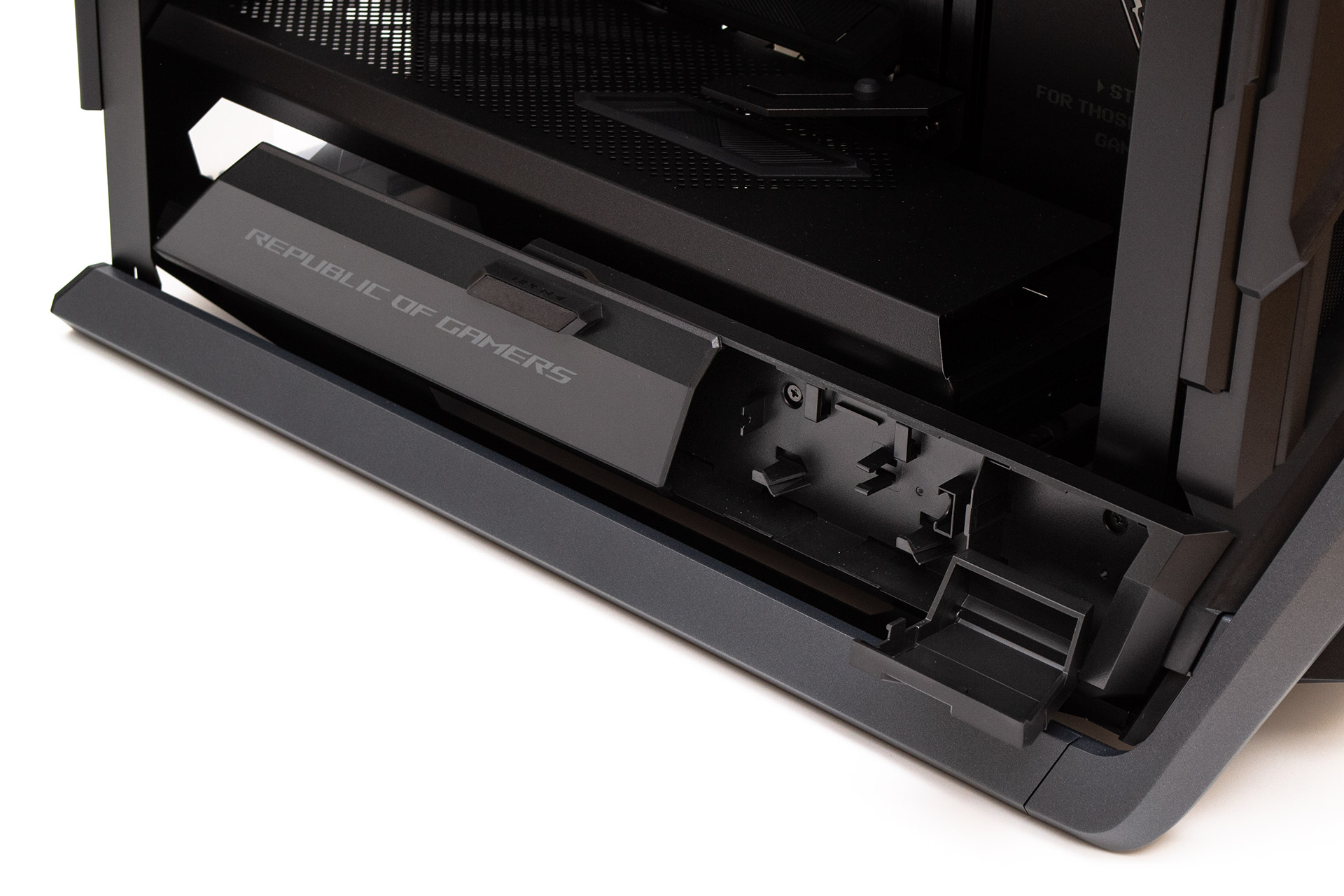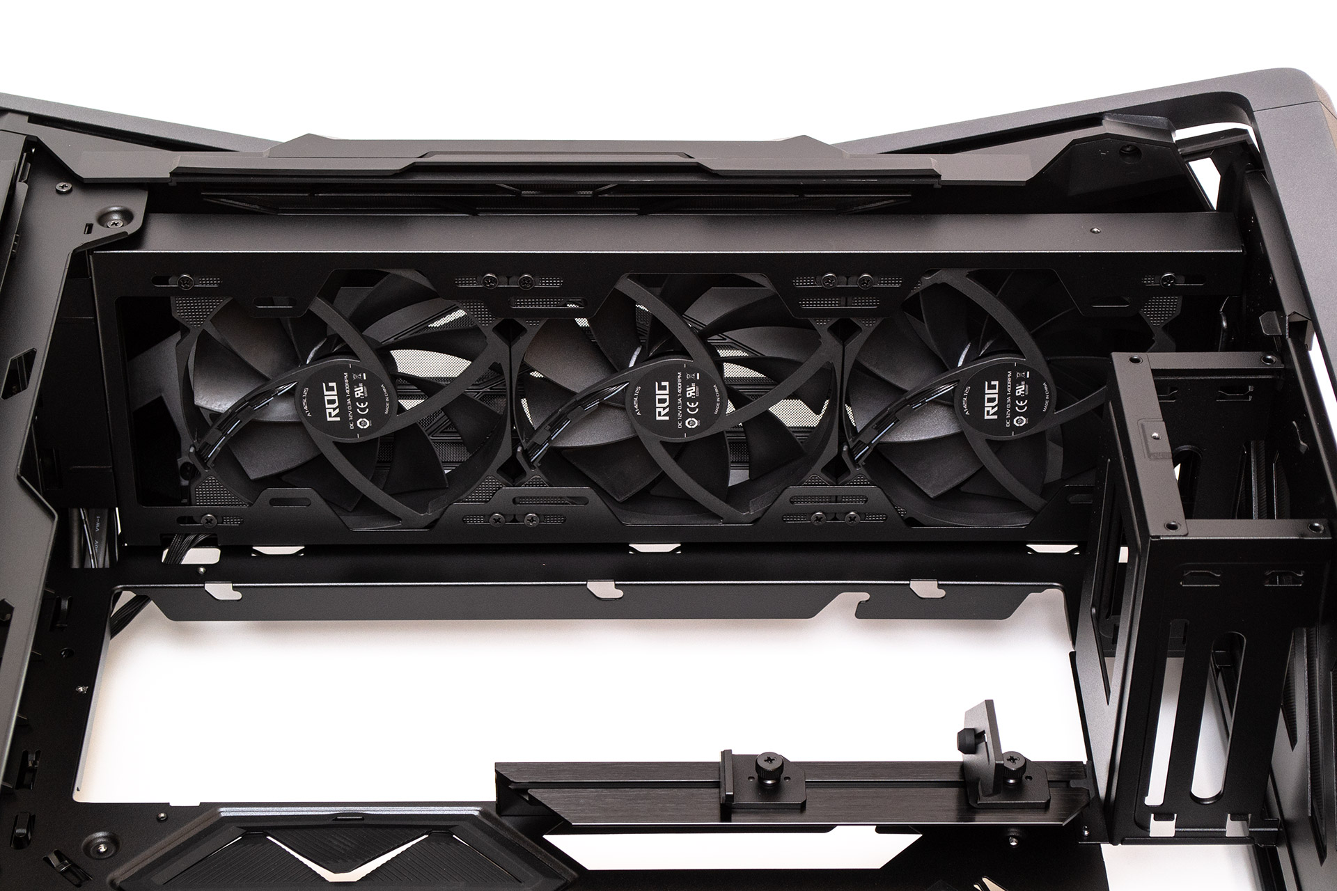 Сзади на вытяжку из корпуса закреплен 140-мм вентилятор, с маркировкой ROG A1425L12S. Его максимальная скорость составляет 1400 об/мин и регулируется с помощью ШИМ. На рамке по углам есть резиновые демпферы вибрации. Разъем питания на четыре контакта, кабель достаточно длинный, чтобы достать до контроллера, расположенного в самом низу за поддоном материнской платы. Все слоты расширения фиксируются обычными винтами, что является странной экономией для корпуса такого класса.