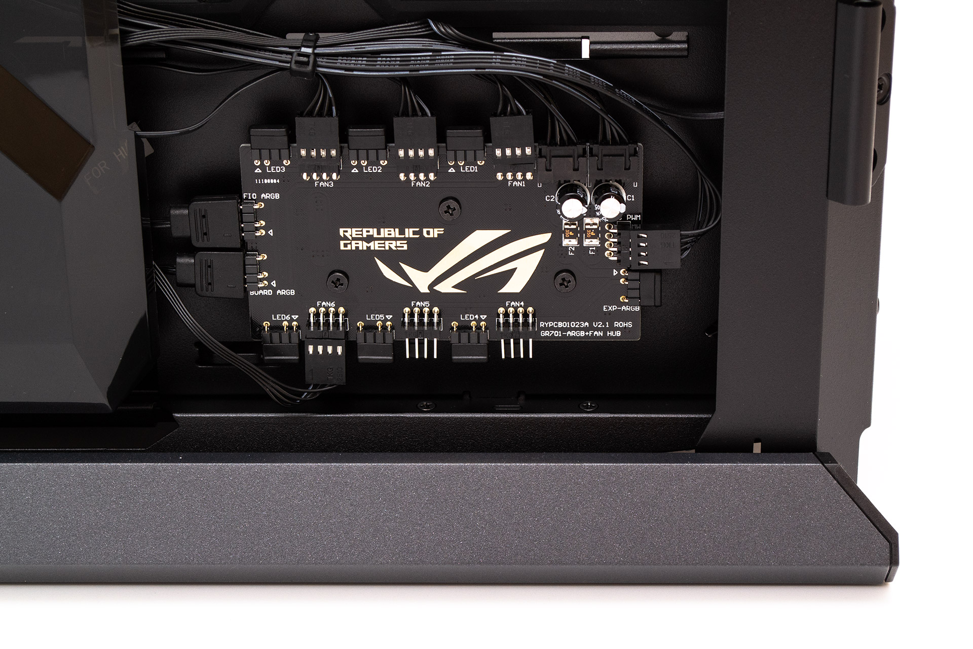 В правом нижнем углу поддона расположена большая плата контроллера. На нем есть порты для подключения шести управляемых ШИМ вентиляторов через разъемы на четыре контакта. Отдельно имеется шесть свободных портов с разъемами подсветки +5VDG, закрытых резиновыми заглушками. Еще два +5VDG порта заняты подсветкой боковой и передней панели. Сзади есть выход для ШИМ управления вентиляторами на материнскую плату и еще один сквозной разъем +5VDG под заглушкой. Сверху справа установлены сразу два входа питания устройства.