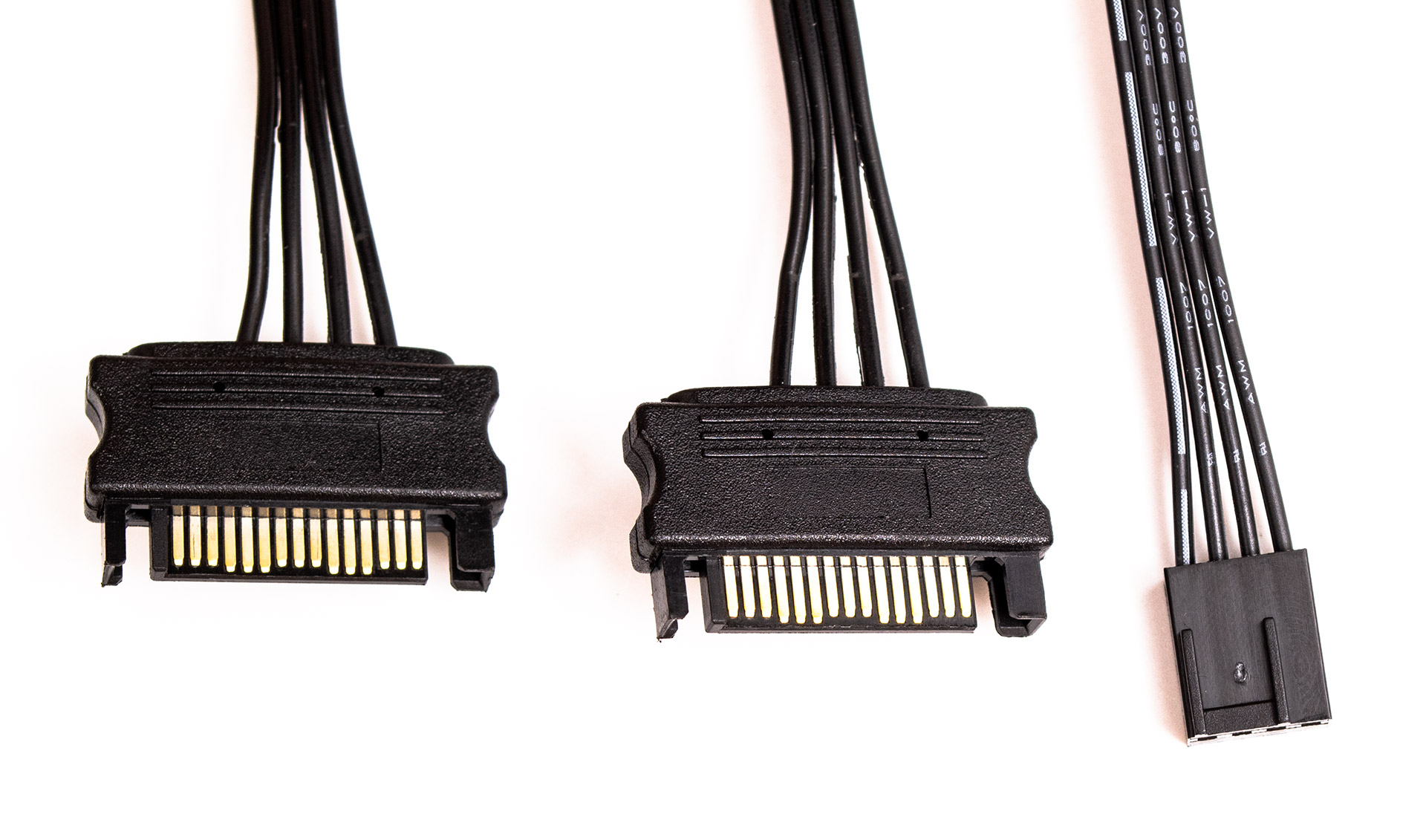 Контроллер имеет два кабеля SATA Power для питания и один кабель для синхронизации ШИМ управления вентиляторами с материнской платой.