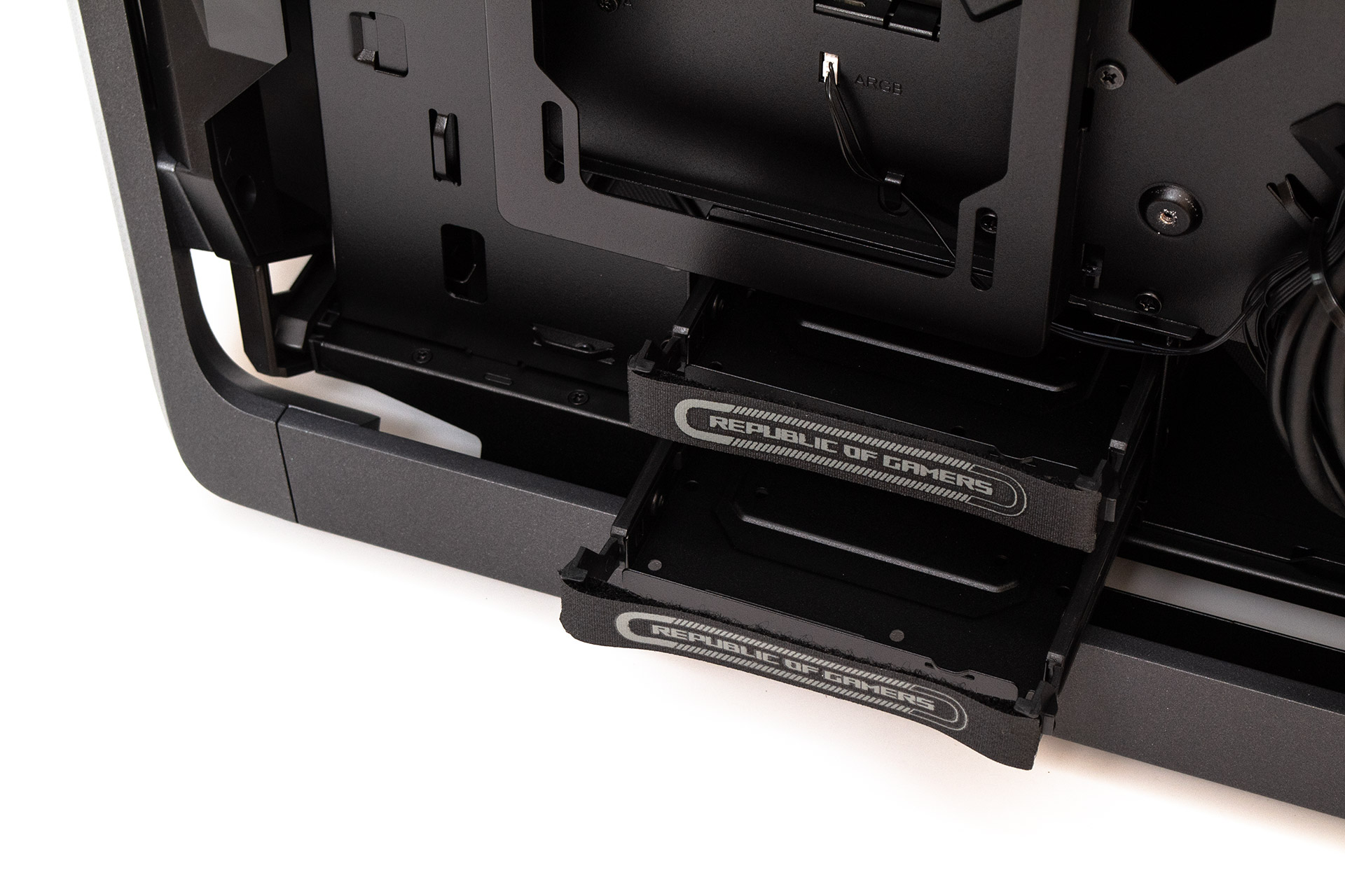Внизу ближе к передней части находится корзина с выдвижными лотками для двух 2,5" или 3,5" накопителей. На них есть мягкие липучие ленты вместо обычных пластиковых ручек.