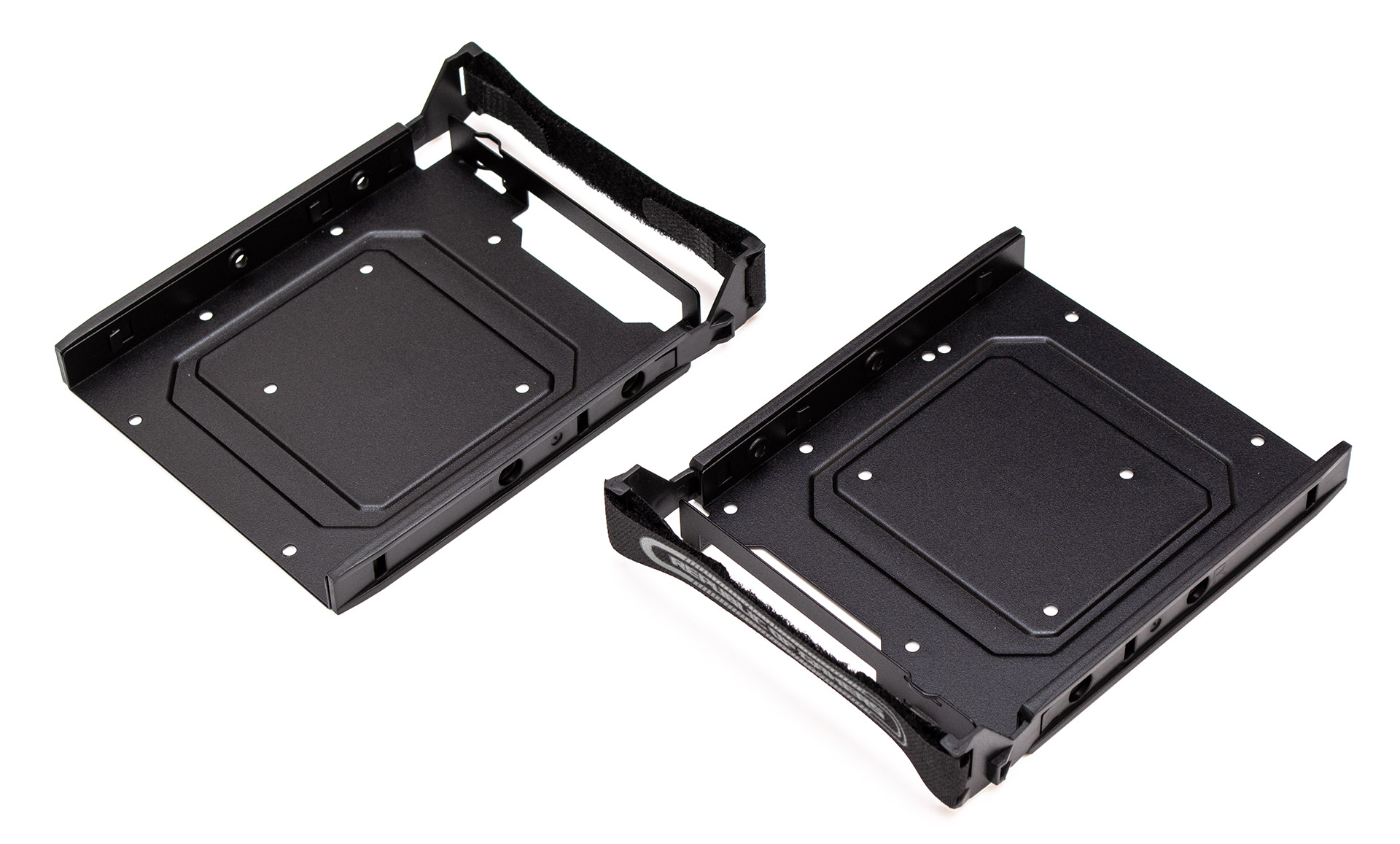 Корзины изготовлены из металла, с пластиковыми фиксаторами по бокам, но без вибрационных демпферов. В каждую из них можно установить один 2,5" или 3,5" накопитель или даже резервуар СЖО, закрепив его четырьмя винтами.