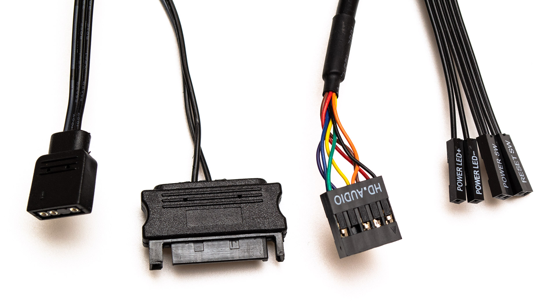 В набор кабелей от корпуса входит кабель +5VDG для синхронизации подсветки с материнской платой, кабель дополнительного питания SATA Power для портов USB, разъем HD Audio и наборы парных проводов от кнопок запуска и перезагрузки ПК и индикатора питания.