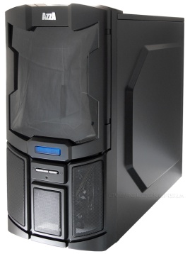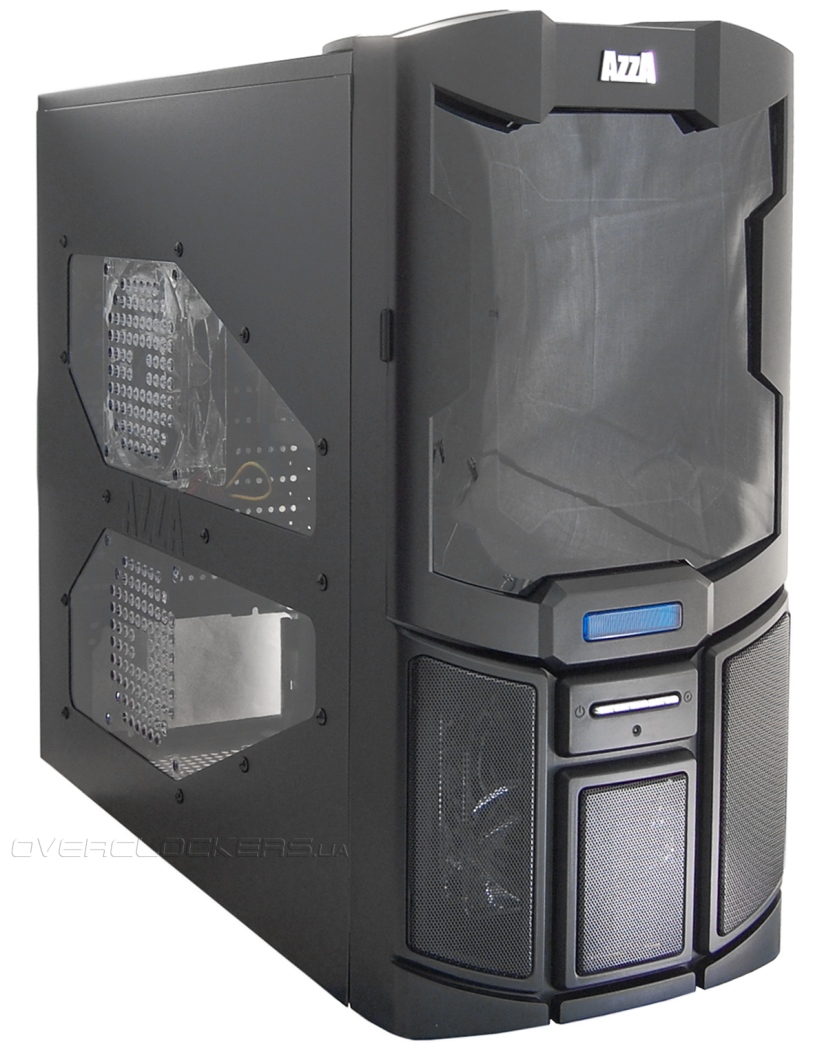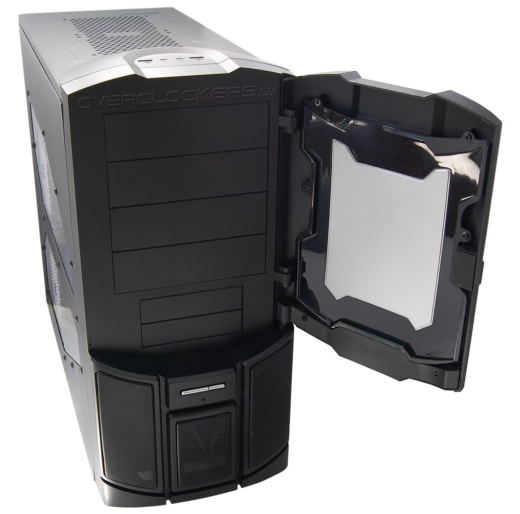 Все выполнено в черном цвете, только над кнопками Power и Reset есть подсвечиваемая синяя пластиковая вставка. Пятидюймовые отсеки закрыты дверцой, фиксирующейся магнитом. К каркасу дверцы прикручена блестящая панель, на которой отлично видно пыль.