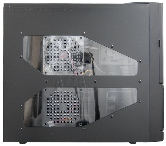 Боковая стенка имеет двухсекционное окно с прикрученным 120-мм вентилятором. Он распложен напротив процессора, но соответствующие отверстия позволяют разместить еще один вентилятор напротив видеокарты.