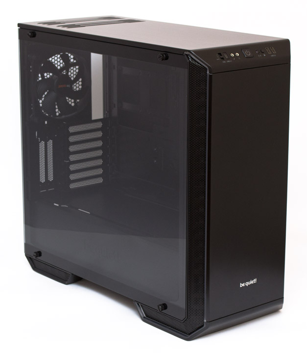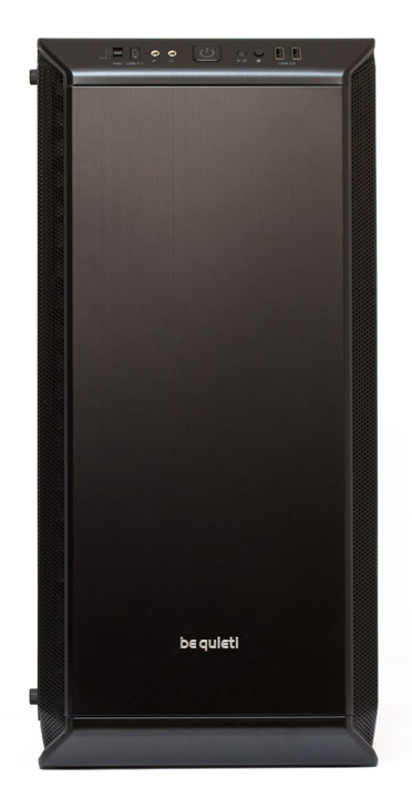Общая концепция дизайна моделей корпусов у be quiet! (если не считать первой ласточки в лице Silent Base 800) остается неизменной — это практичная квадратная коробка черного цвета, шарма которой прибавляет использование «дорогих» материалов (в частности стекла и алюминиевого покрытия) и наклонных граней передней панели. Фронтальная панель, и ее нижняя и верхняя грань, покрыта листами шлифованного алюминия. На первый взгляд кажется, что панель монолитная, и если бы в инструкции не было написано о возможности ее демонтажа, то я бы даже и не пытался это делать. Вентиляционные отверстия сделаны на боковых гранях, по всей высоте и покрыты металлической сеточкой. Светодиоды RGB-подсветки встроены тоже по всей высоте на стыке сетки и фронтального металла. Серебристый логотип компании наклеен снизу, внешних выходов для 5,25″ дисков тут нет.