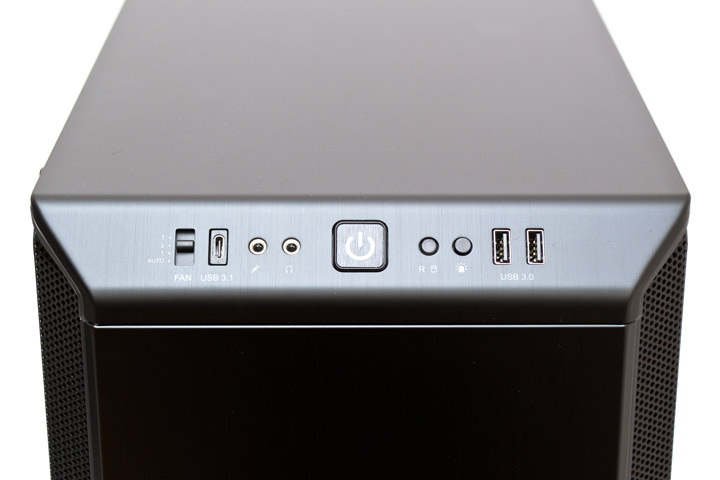 На верхней наклонной грани было обнаружено нечто необычное, а именно слева, рядом с четырехпозиционным ползунком управления вентиляторами, встроен маленький порт USB 3.1 Gen2 Type-C. На моей памяти это второй раз после Lian-Li, когда производитель удосужился внедрить этот новый разъем в шасси, и уж точно первый раз на отечественном рынке. Далее установлены уже вполне привычные 3,5-мм аудиовыходы для наушников и микрофона, квадратная клавиша запуска ПК, мелкая круглая кнопка перезагрузки системы, еще одна такая же кнопка управления подсветкой и два порта USB 3.0, окрашенные в черный цвет.