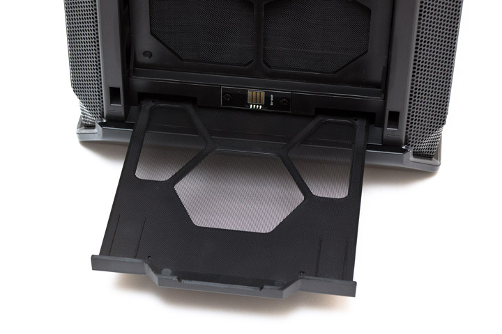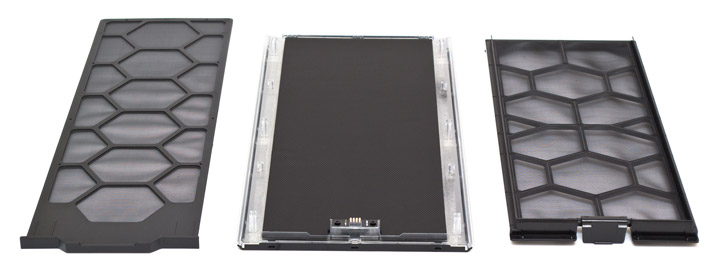Нижний пылевой фильтр выдвигается вперед, и это очень удобно, ведь для его очистки корпус не приходится смещать, поднимать или поворачивать. Над ручкой фильтра расположены контактные разъемы светодиодов подсветки, к которым прижимается соответствующий разъем передней панели, когда она закрыта.