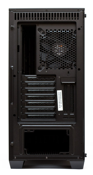 Задняя панель выглядит достаточно обычно. На решетку вытяжного вентилятора можно закрепить как 120- так и 140-мм модели, причем для последних в ребрах жесткости, справа вверху и слева внизу, специально сделали отверстия под отвертку. Слотов расширения PCI семь, но справа от них есть еще два вертикальных слота для любителей использовать «рейзеры». Все слоты закрыты многоразовыми вентилируемыми заглушками. Посадочные отверстия блока питания позволяют ориентировать его при монтаже как вентилятором вверх, так и вниз.