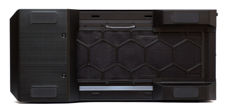 Основание корпуса закрыто пылевым фильтром, через который просматривается крупная сотовая решетка для вентиляции блока питания, и еще одна решетка впереди, куда можно прикрепить один 120- или 140-мм вентилятор с помощью длинных винтов изнутри. Задние ножки пластмассовые с резиновыми нашлепками. А впереди у корпуса сделана массивная деталь, покрытая алюминием, на которой тоже есть резиновые наклейки и которая, судя по структуре, отлично будет собирать пыль внутри.