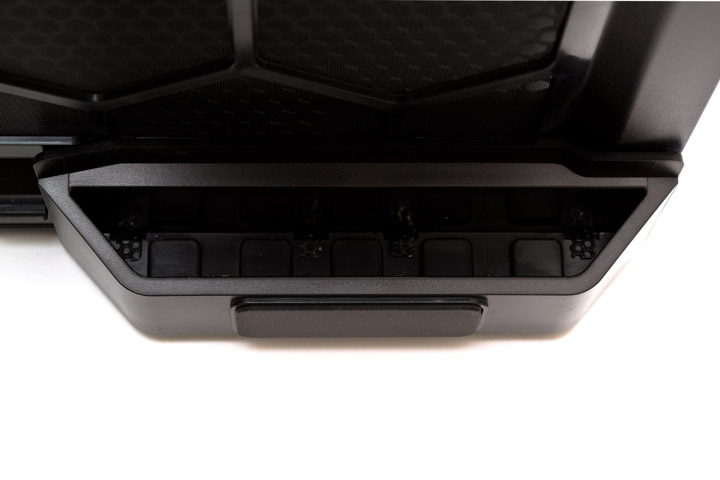 Задние ножки полые внутри, их высота составляет 35 мм, чего вполне хватит для нормальной вентиляции внутренностей корпуса через нижнюю панель. На внешних сторонах всех ножек одета декоративная решетка с мелкими отверстиями, имитирующими вентиляцию.