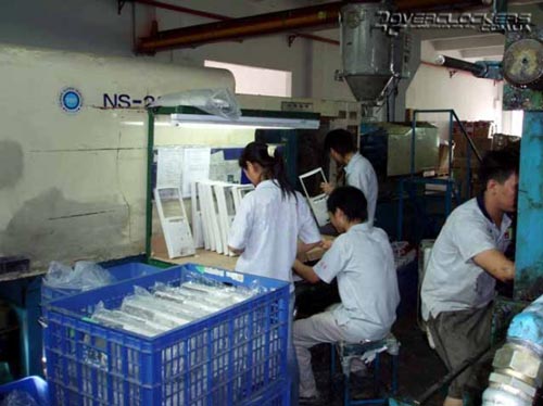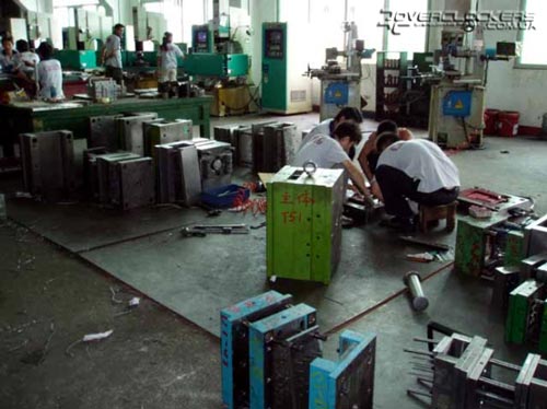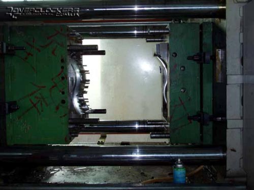 Тут нас ожидает новый цех, состоящий из станков для литья. В аппарат устанавливается нужная пресс-форма. Далее в нее закачивают пластик. Потом он охлаждается и затвердевает, после чего форма раздвигается и вытаскивается готовая деталь. Китайский рабочий бодро обрезает все заусеницы и заряжает аппарат на следующее литье.