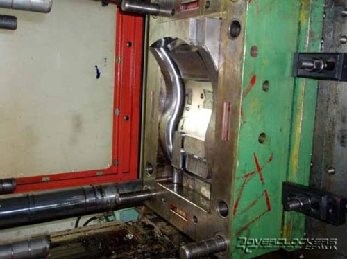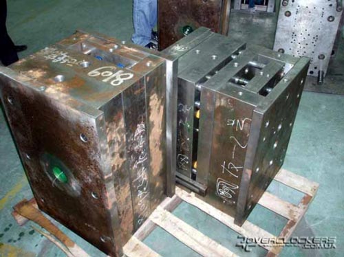 А тут льют корпуса для японских таксофонов – на фото пресс-форма в раздвинутом состоянии, лицевую панель только извлекли.