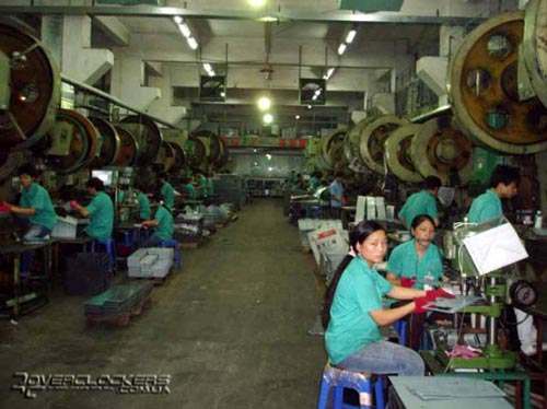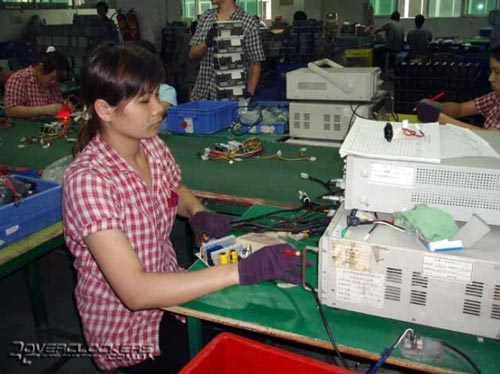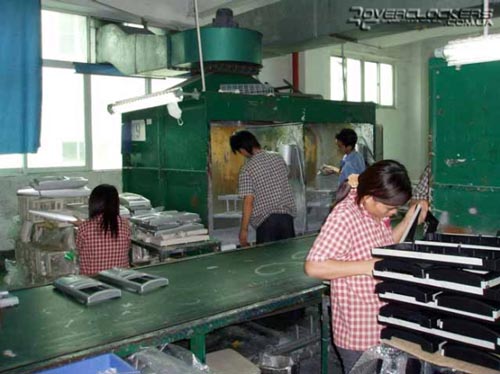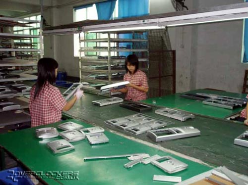 Ах, как хотелось бы увидеть современную сборочную линию с длинными руками-манипуляторами, выполняющими монотонную работу быстро и качественно! Увы, роботы стоят дорого, а вот китайские рабочие – очень даже доступны. Абсолютно все этапы сборки корпуса производятся вручную. Для начала собирается каркас с помощью обычных заклепок – рабочие шустро орудуют пневмопистолетами.