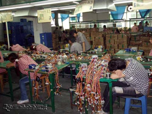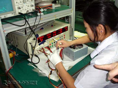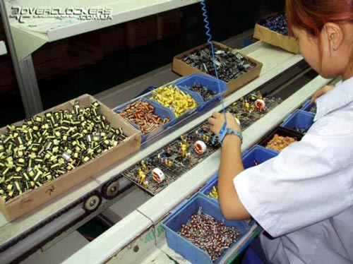 Опустим момент создания печатной платы, компонентов и собственно самой разработки блоков. Тут каждый старается как может – кто-то скопирует чужой блок, у кого-то целый отдел инженеров трудится над разработкой новых моделей. Самые продвинутые фабрики производят даже элементарную базу – мотают дроссели, льют разъемы. Некоторые закупают все комплектующие на стороне и производят только окончательную сборку блоков. Процесс производства БП везде примерно одинаковый. Печатная плата двигается по конвейеру, и каждый работник устанавливает свою группу элементов.
