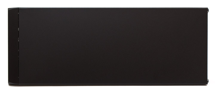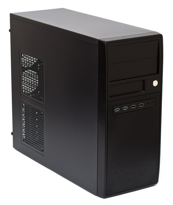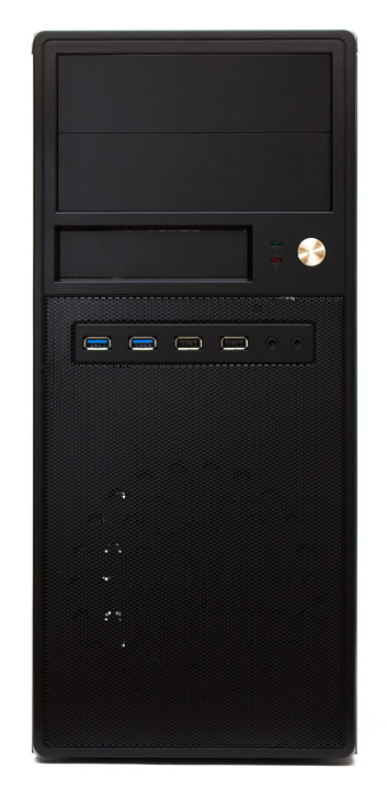 Дизайн корпуса предельно прост. Это правильная стальная коробка черного цвета с ровной пластиковой передней панелью. В верхней части есть два отсека под устройства формата 5,25″ и один под 3,5″. Большая половина фронта снизу занята металлической решеткой с мелкими ячейками.