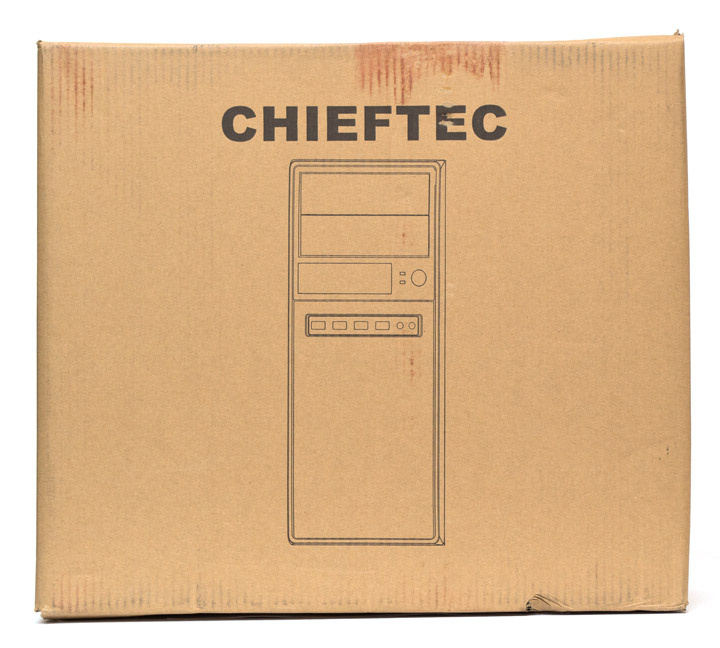 Корпус поставляется на рынок в обычной коробке, на которой спереди и сзади схематично изображен лишь внешний вид фронтальной панели. Характеристик нигде нет, на боковинах указана логистическая информация, модель шасси и наличие (либо отсутствие в комплекте блока питания). Защита от повреждений при перевозке обеспечивается двумя демпферами из пенопласта и полиэтиленовым пакетом. Ручек на боках коробки нет.
