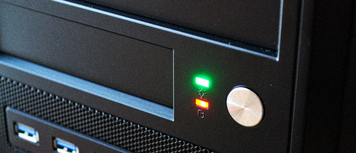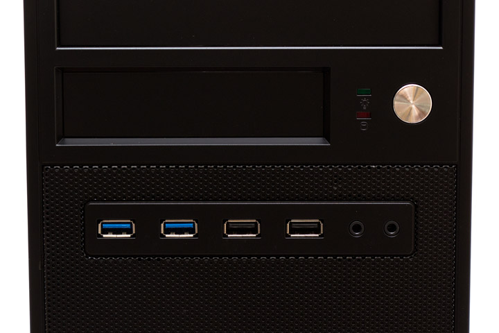Круглая серебристая кнопка старта и два индикатора: питания системы (зеленый) и активности накопителей (красный), расположены по центру справа. Чуть ниже находится вставка, на которой разместились два порта USB 3.0, два разъема USB 2.0 и еще два 3,5-мм выхода под микрофон и наушники.