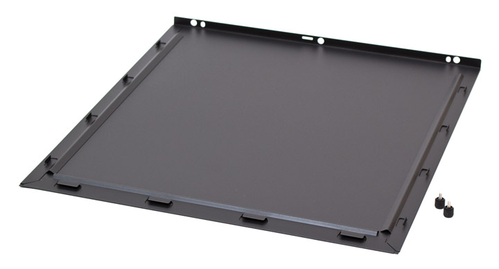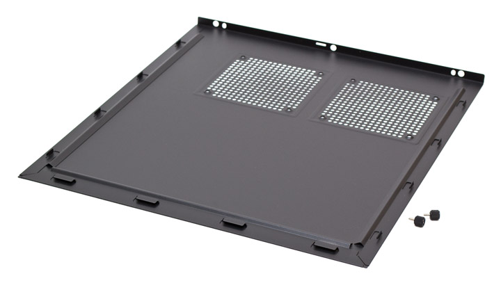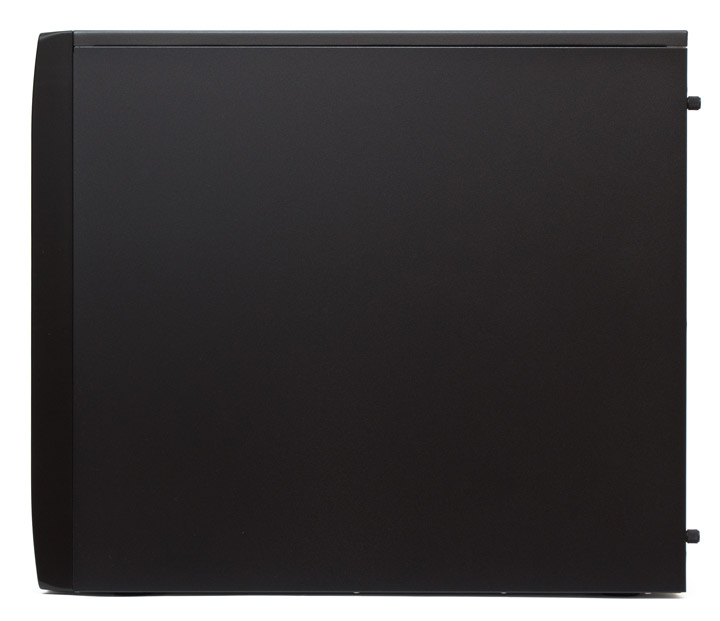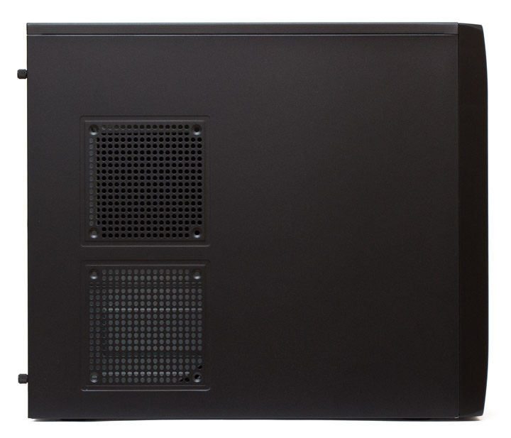 Левая панель имеет два решетчатых вентиляционных отверстия в задней части, на которые можно закрепить два 120-мм вентилятора. Держится боковая дверца на винтах с накатанной пластмассовой головкой.