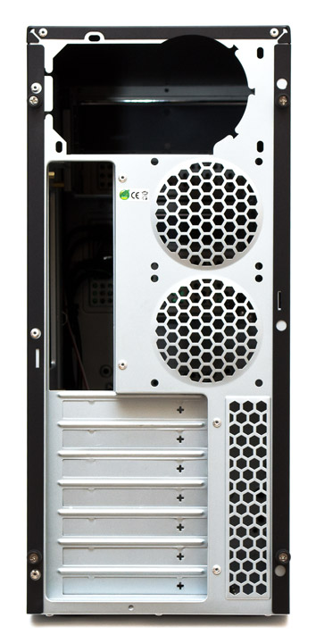Сзади все выглядит почти стандартно. Вверху — посадочное место под блок питания (возможна ориентация исключительно вентилятором вниз). Внизу — семь слотов расширения PCI, закрытых одноразовыми заглушками. Справа от них находится небольшая вертикальная вентиляционная решетка. Посередине задней панели расположены две круглые решетки под 80-мм вентиляторы. Нужно отметить, что в наше время это крайне редкое решение, в некотором роде даже атавизм.