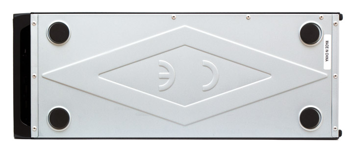 На дне есть четыре мягкие наклеенные ножки, высотой в 3–4 мм. В передней панели снизу есть отверстие для ее демонтажа.
