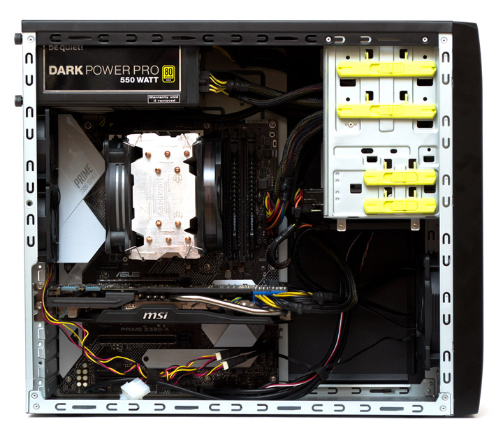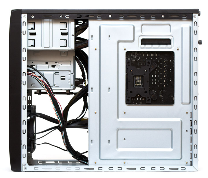 Сборку системы в корпусе Chieftec CG-04B-OP следует начинать с монтажа блока питания и 3,5″ накопителей, поскольку установить это все потом, не задев материнскую плату, может быть проблематично. Завершать сборку стоит установкой видеокарты, уже после того, как были подключены все внутренние разъемы. Как видно, вырез под усилительную пластину открывает доступ к ней не полностью.